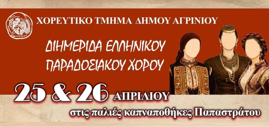Με μεγάλη χαρά προσκαλείστε στην Διημερίδα Ελληνικού Παραδοσιακού Χορού που διοργανώνει το Χορευτικό Τμήμα Δήμου Αγρινίου, στις 25 & 26 Απριλίου, στις παλιές καπναποθήκες Παπαστράτου.