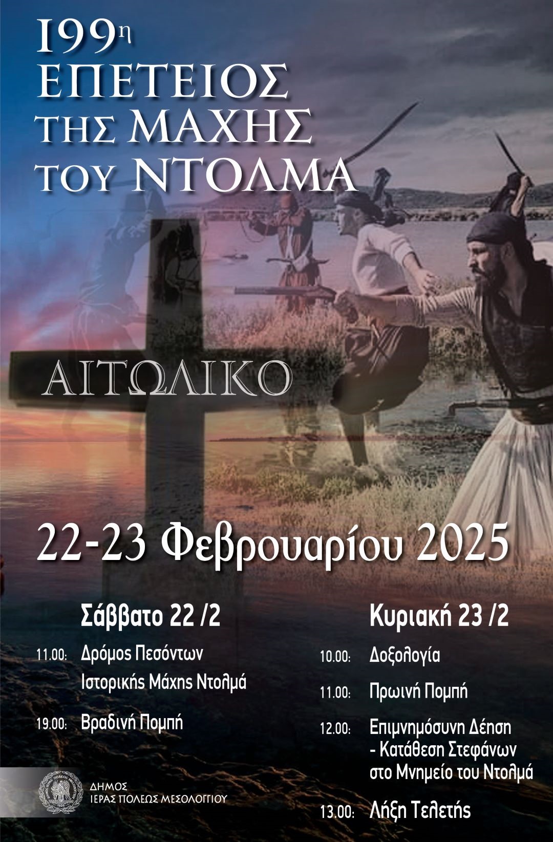 Ο Δήμος Ιεράς Πόλεως Μεσολογγίου τιμά την 199η Επέτειο της Μάχης του Ντολμά με την πραγματοποίηση του καθιερωμένου Αγώνα Δρόμου Πεσόντων και σειρά εκδηλώσεων, οι οποίες θα πραγματοποηθούν σύμφωνα με το παρακάτω πρόγραμμα: