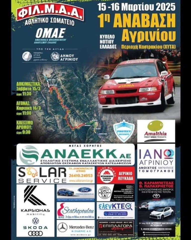 Η Αγωνιστική Λέσχη Αυτοκινήτου ΦΙΛ.ΜΑ (Φίλοι Μηχανοκίνητου Αθλητισμού Αγρινίου) μετά από έγκριση της ΕΠΑ/ΟΜΑΕ, οργανώνει τον Αγώνα 1η Ανάβαση Αγρίνιου, ο οποίος θα διεξαχθεί στις 15-16 Μαρτίου 2025 στο δρόμο προς ΧΥΤΑ Αγρινίου, κοντά στο Καστράκι. Ο συγκεκριμένος αγώνας ανοίγει την αυλαία των ελληνικών αναβάσεων και του Κυπέλλου Αναβάσεων Νοτίου Ελλάδος.