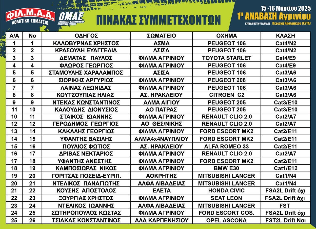 Η ΦΙΛ.Μ.Α. Αγρίνιου είναι στην ευχάριστη θέση να προσκαλέσει όλους τους φίλους του μηχανοκίνητου αθλητισμού, αγωνιζόμενους, στελέχη και φιλάθλους να πάρουν μέρος, στην πρώτη ανάβαση του έτους 2025, σε μία μεγάλη γιορτή για το motorsport. Σε μία διαδρομή μήκους 3.650 μέτρων , όπου κανένας δεν έχει "τρέξει ακόμα, σε απόσταση αναπνοής από το Αγρίνιο και σε ένα μέρος απαράμιλλης φυσικής ομορφιάς, δίπλα από τον ποταμό Αχελώο και με θέα όλες τις τεχνητές του λίμνες.