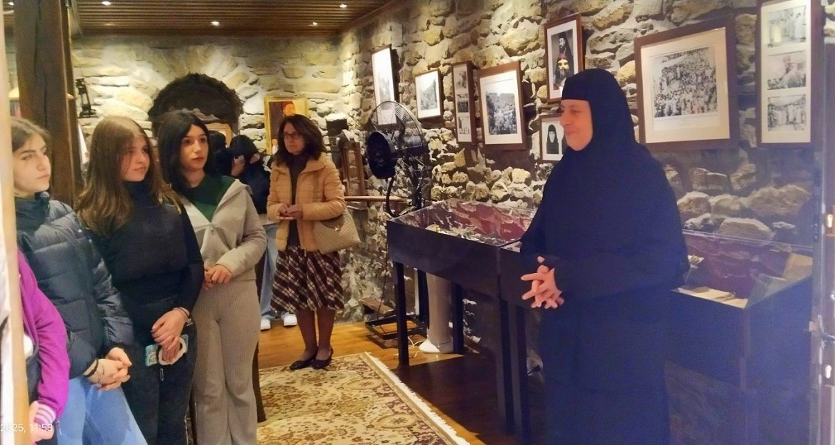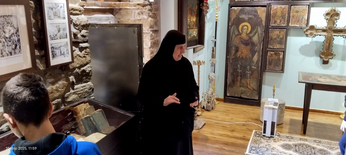 Η σεβαστή και Λογιοτάτη Γερόντισσα Μαριάμ υποδέχθηκε εγκάρδια εκπαιδευτικούς και μαθητές, μαζί με την συνοδεία της. Κατά την ομιλία της αναφέρθηκε στην ιστορία της Μονής, που αποτελούσε στην τουρκοκρατία τόπο καταφυγής και προστασίας για τους υπόδουλους κατοίκους της περιοχής.