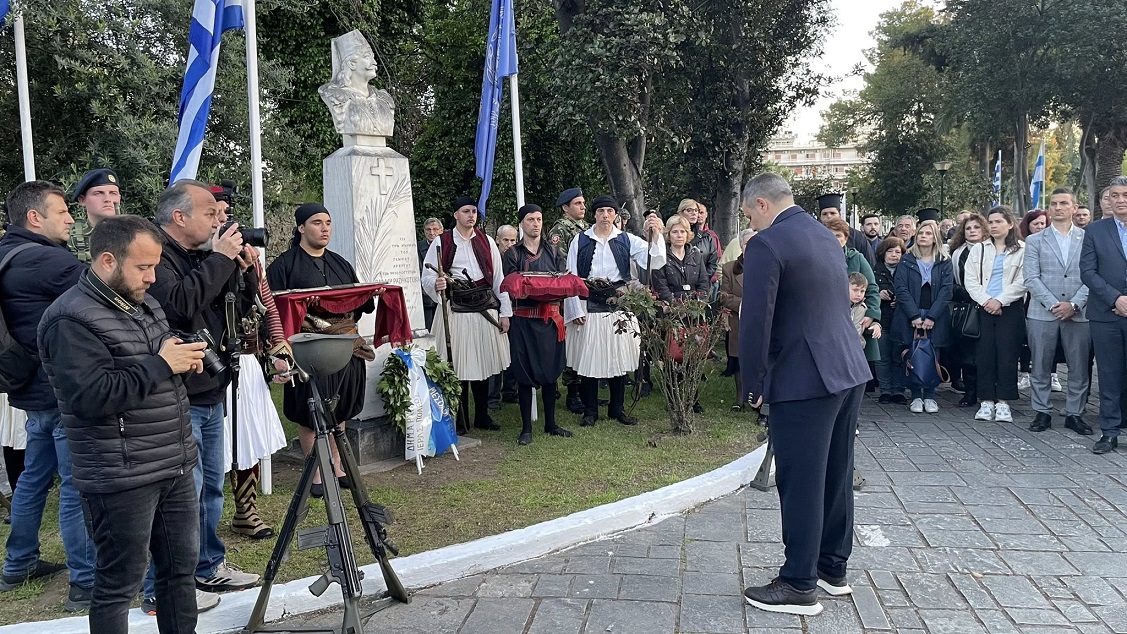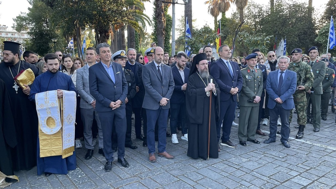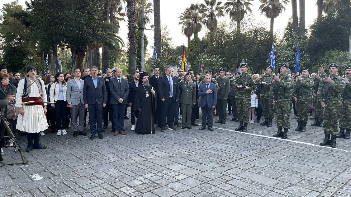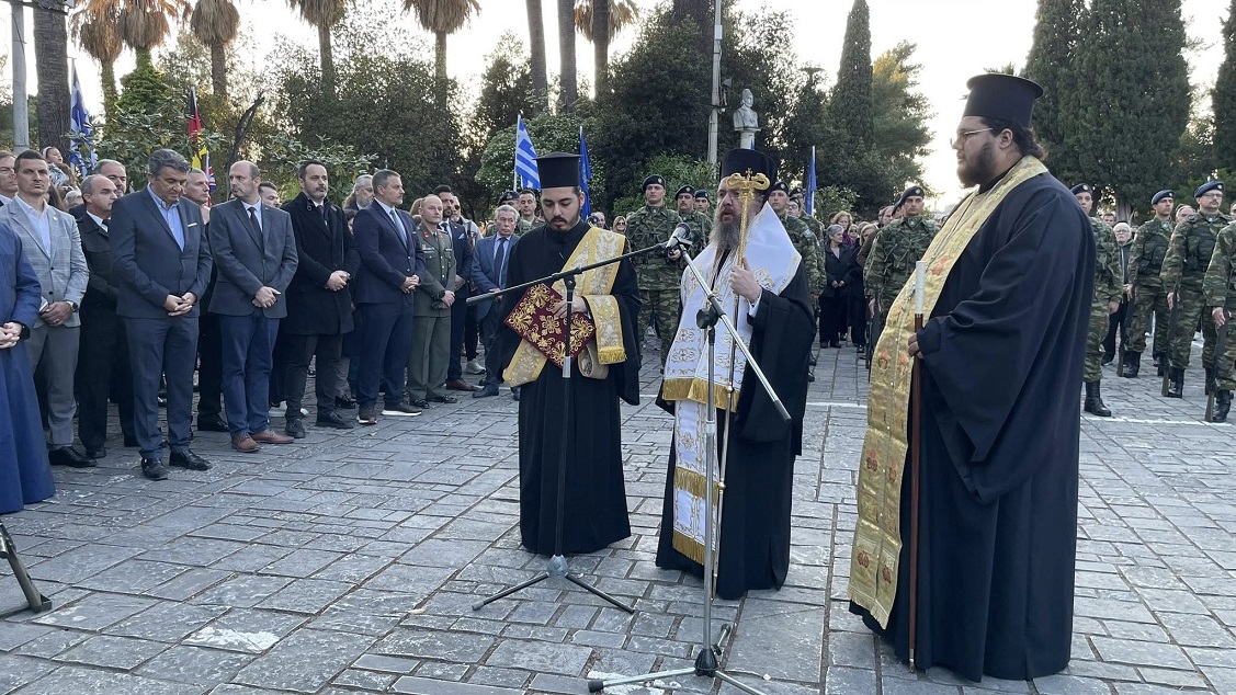 Στη συνέχεια, με παιανίζουσα την Φιλαρμονική «Διονύσιος Σολωμός» και άγημα του Ιστορικού Συλλόγου, σχηματίστηκε πομπή η οποία κατέληξε στον Κήπο των Ηρώων όπου, μπροστά από την προτομή του τιμώμενου ήρωα τελέσθηκε Επιμνημόσυνη Δέηση, από τον Σεβασμιώτατο Μητροπολίτη, κ. Δαμασκηνό, ενώ εκφωνήθηκαν ολιγόλεπτες ομιλίες από τον τον Δήμαρχο κ. Σπύρο Διαμαντόπουλο και τον εκπρόσωπο της Φιλαρμονικής «Διονύσιος Σολωμός», κ. Τάκη Φωλιά και κατόπιν έγινε κατάθεση στεφάνων.