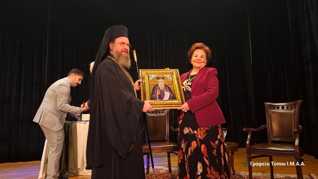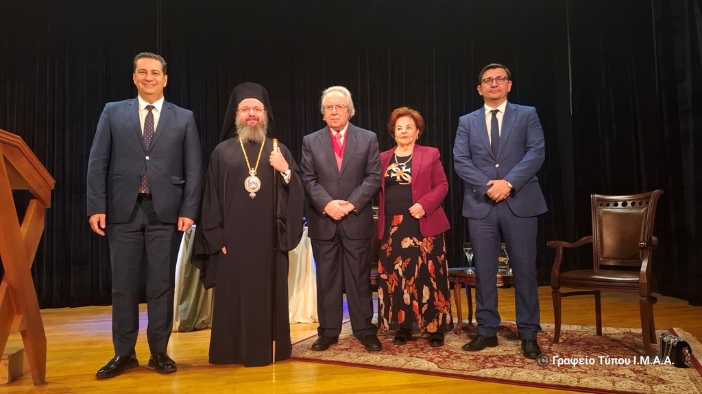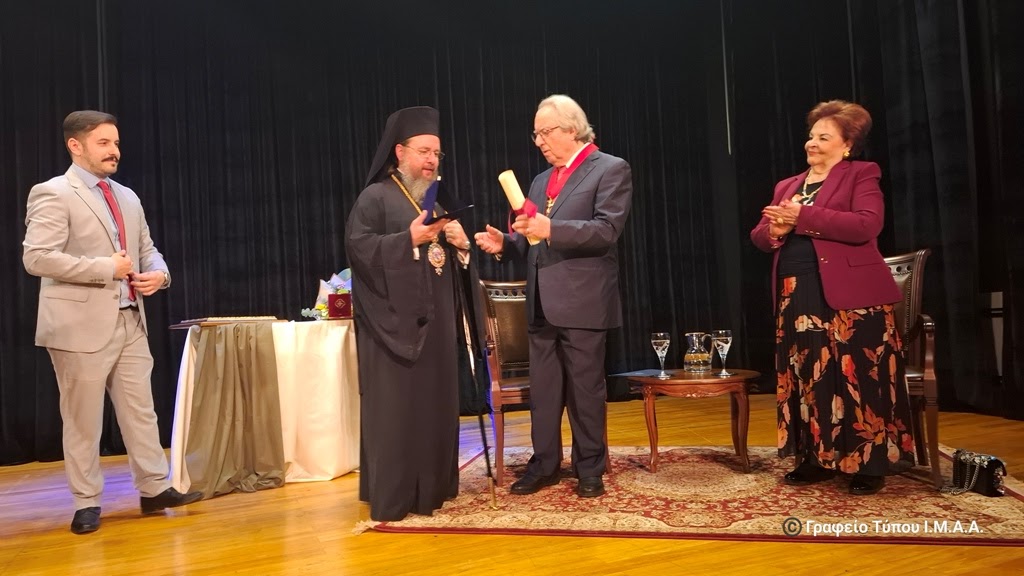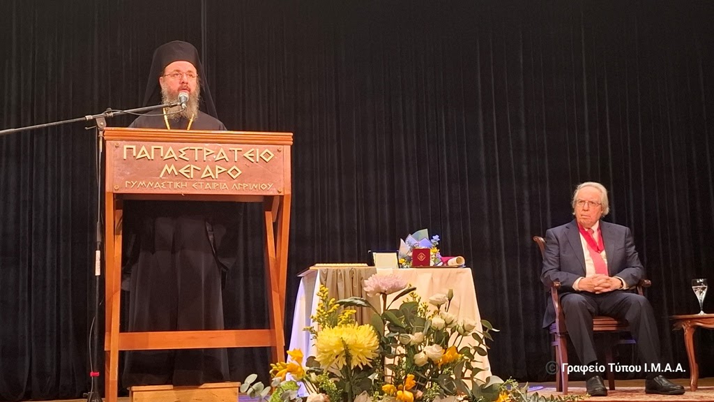 Κύριε Καθηγητά, δεν ξεχάσατε ποτέ τις ρίζες σας. Αντίθετα, τις κάνατε γέφυρα. Και γι’ αυτό, απόψε, μαζί με την αναγνώριση του επιστημονικού σας έργου, σας τιμούμε και ως άξιο τέκνο της Αιτωλοακαρνανίας, που δικαίως μπορεί να υπερηφανεύεται για εσάς! Προσφέροντάς σας την Ανώτατη Διάκριση της Ιεράς Μητροπόλεως Αιτωλίας και Ακαρνανίας, ήτοι του «Χρυσού Σταυρού» καθώς και του Τιμητικού Επαίνου του Ιδρύματος Πολιτισμού της Ιεράς Μητροπόλεώς μας «Άγιος Ευγένιος ο Αιτωλός» αναγνωρίζουμε την όλη σας εκπαιδευτική, ακαδημαϊκή, πολιτισμική και πνευματική προσφορά στη χώρα μας.