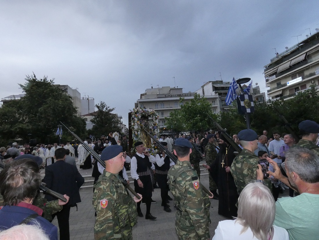 Το απόγευμα, με εκκλησιαστική λαμπρότητα τελέστηκε η ακολουθία του μεθέορτου Εσπερινού στον νέο Ιερό Ναό του Αγίου Χριστοφόρου ενώ κατόπιν σύσσωμος ο ιερός κλήρος, οι πολιτικές και αυτοδιοικητικές αρχές, εκπρόσωποι των Σωμάτων Ασφαλείας, πολιτιστικοί σύλλογοι και πλήθος πιστών, συμμετείχαν πάνδημα στην λιτάνευση της ιερής εικόνας στους δρόμους της πόλης. Ο Μητροπολίτης Νέας Κρήνης και Καλαμαριάς κ. Ιουστίνος, Πολυανής και Κιλκισίου κ. Βαρθολομαίος, Φλωρίνης, Πρεσπών και Εορδαίας κ. Ειρηναίος και Αιτωλίας και Ακαρνανίας κ. Δαμασκηνός συνόδευσαν την εικόνα.
