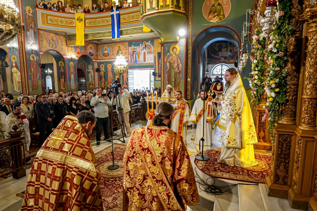 Στην ακολουθία του Όρθρου και στην πολυαρχιερατική Θεία Λειτουργία, που τελέσθηκαν στον νέο Ιερό Ναό του Αγίου Χριστοφόρου, προεξήρχε ο Μητροπολίτης Νέας Κρήνης και Καλαμαριάς κ. Ιουστίνος και συλλειτούργησαν οι Μητροπολίτες Πολυανής και Κιλκισίου κ. Βαρθολομαίος, Φλωρίνης, Πρεσπών και Εορδαίας κ. Ειρηναίος και Αιτωλίας και Ακαρνανίας κ. Δαμασκηνός.