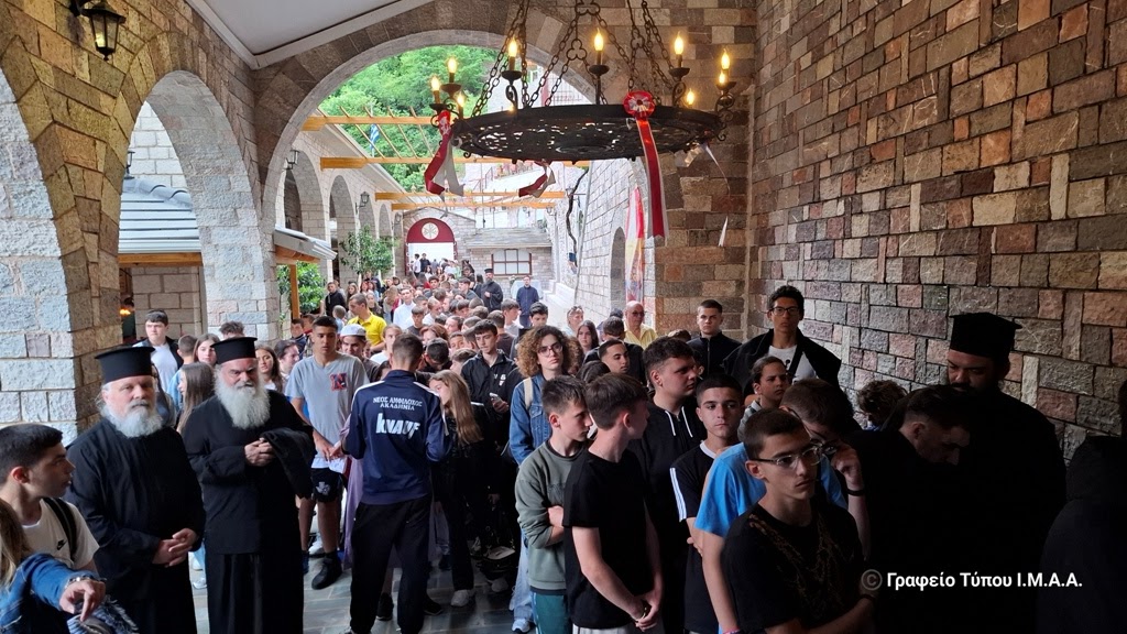 Ο Σεβασμιώτατος Μητροπολίτης Αιτωλίας και Ακαρνανίας κ. Δαμασκηνός ευχαρίστησε τον Άγιο Καθηγούμενο για την θερμή υποδοχή και τη φιλοξενία. Αναφέρθηκε στη γνωριμία που τους συνδέει από την Ιερά Μητρόπολη Δημητριάδος και απευθυνόμενος στους νέους και τις νέες σημείωσε, ότι η εκδρομή αυτή είναι ένας θεσμός πλέον για την Ιερά Μητρόπολη Αιτωλίας και Ακαρνανίας και θα πραγματοποιείται κάθε χρόνο. Επίσης ευχήθηκε σε όλους καλό καλοκαίρι και καλή επιτυχία στις εξετάσεις που ακολουθούν και κάλεσε τα παιδιά να συμμετάσχουν στις Κατασκηνώσεις της Ιεράς Μητροπόλεως.