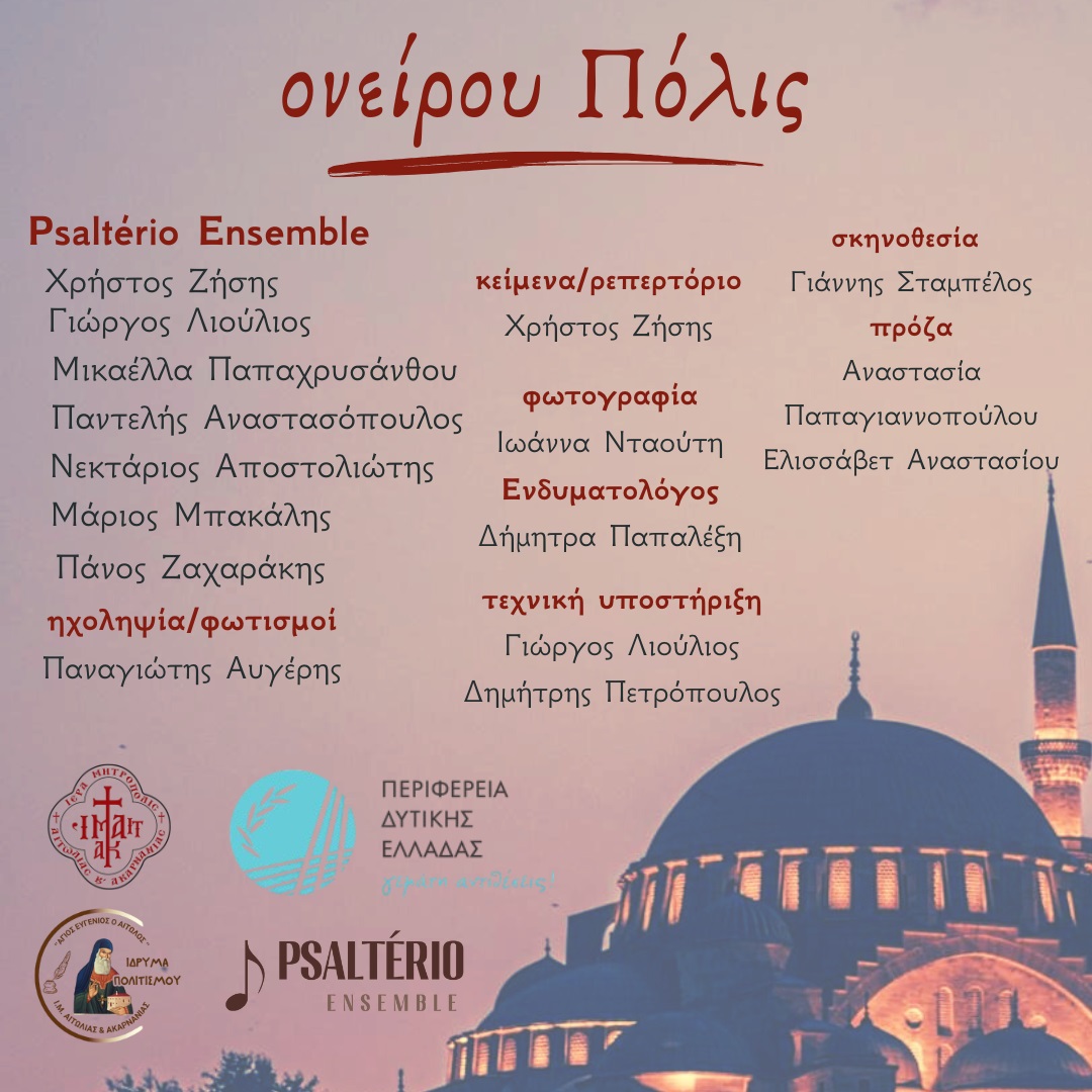 Το Ίδρυμα Πολιτισμού της Ιεράς Μητροπόλεως Αιτωλίας και Ακαρνανίας «Άγιος Ευγένιος ο Αιτωλός», με αφορμή την επέτειο της Αλώσεως της Κωνσταντινούπολης στις 29 Μαΐου του 1453 συνδιοργανώνει με την Περιφέρεια Δυτικής Ελλάδος και το μουσικό σχήμα Psalterio, την μουσική παράσταση- αφιέρωμα: "ονείρου Πόλις".
