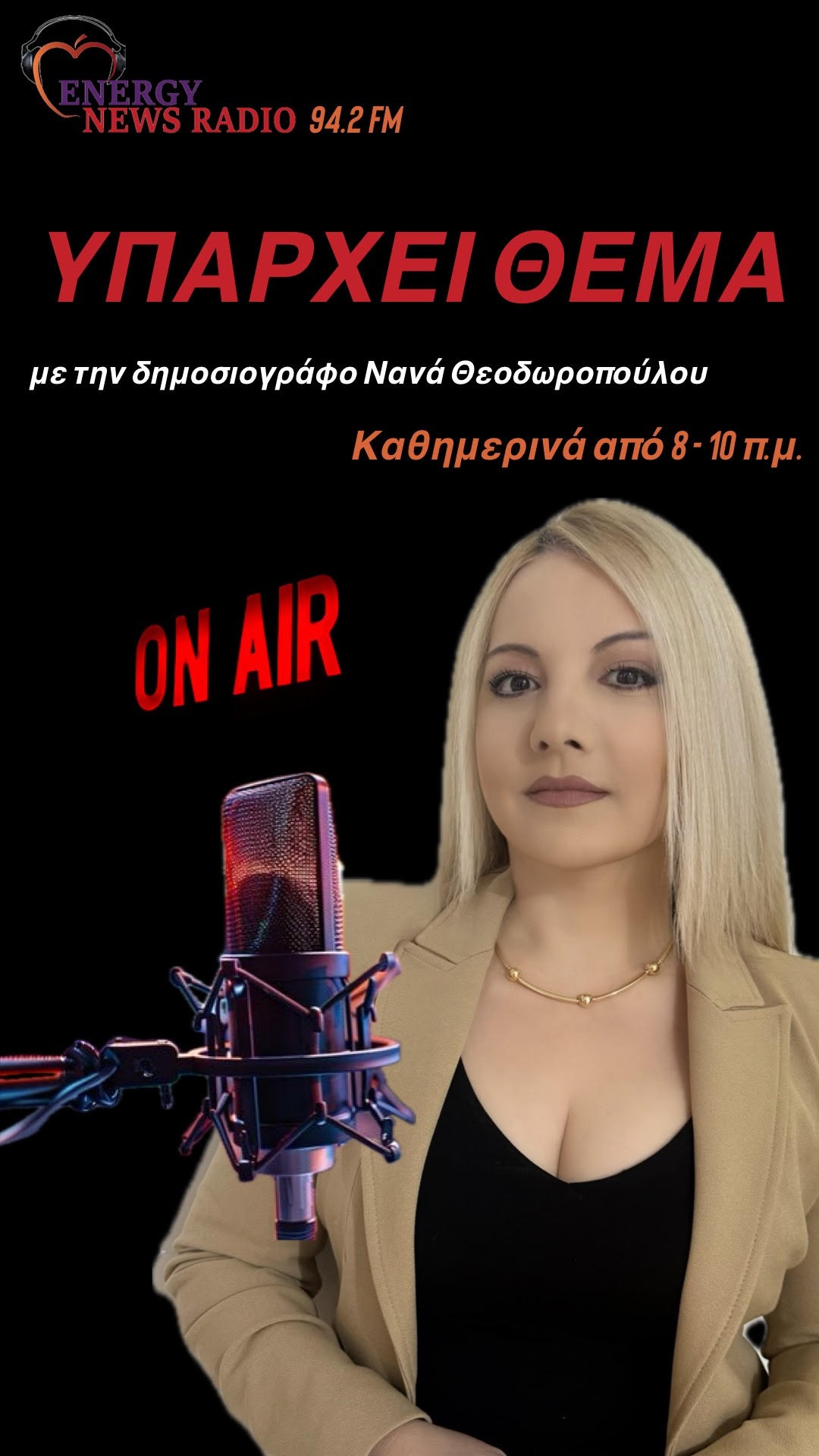 Στην ραδιοφωνική ενημερωτική εκπομπή «Υπάρχει θέμα» που παρουσιάζει καθημερινά 8 με 10 το πρωί από την συχνότητα του Energy 94.2 fm η δημοσιογράφος Νανά Θεοδωροπούλου, φιλοξενήθηκε σήμερα ο Γιώργος Πανταζόπουλος, υπεύθυνος της ιστοσελίδας kalyvia.gr για τις ζημιές που προκλήθηκαν από το χαλάζι, σε καλλιέργειες στα Καλύβια.