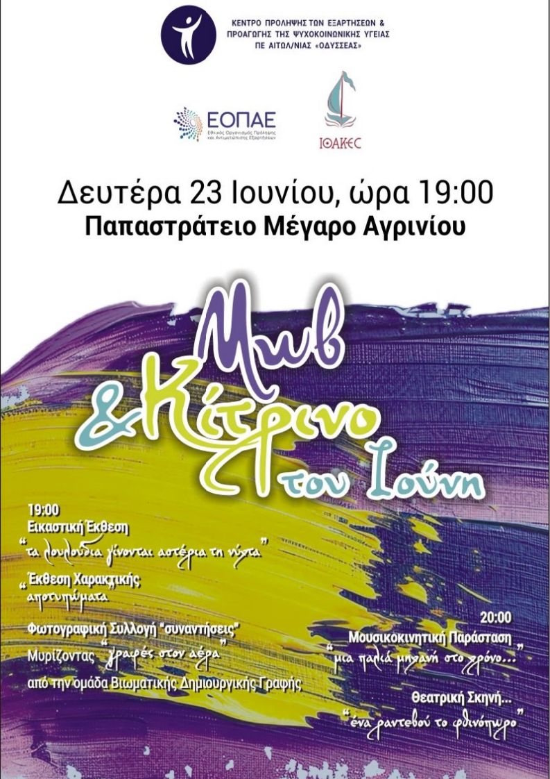 Εκδήλωση υπό τον τίτλο "Μωβ & Κίτρινο του Ιούνη" πραγματοποιεί την Δευτέρα 23 Ιουνίου και ώρα 19:00 μ.μ. στο Παπαστράτειο Μέγαρο Αγρίνιου, το Κέντρο Πρόληψης των Εξαρτήσεων και Προαγωγής της Ψυχοκοινωνικής Υγείας Π.Ε. Αιτωλοακαρνανίας «ΟΔΥΣΣΕΑΣ».