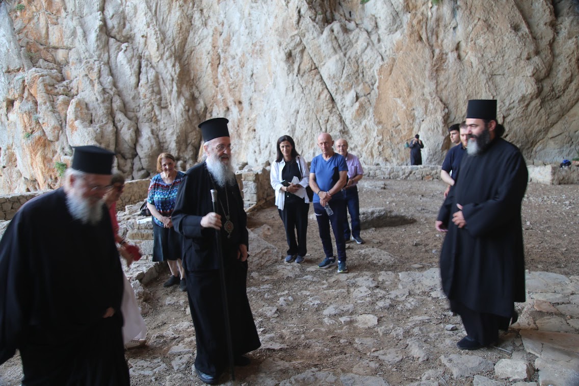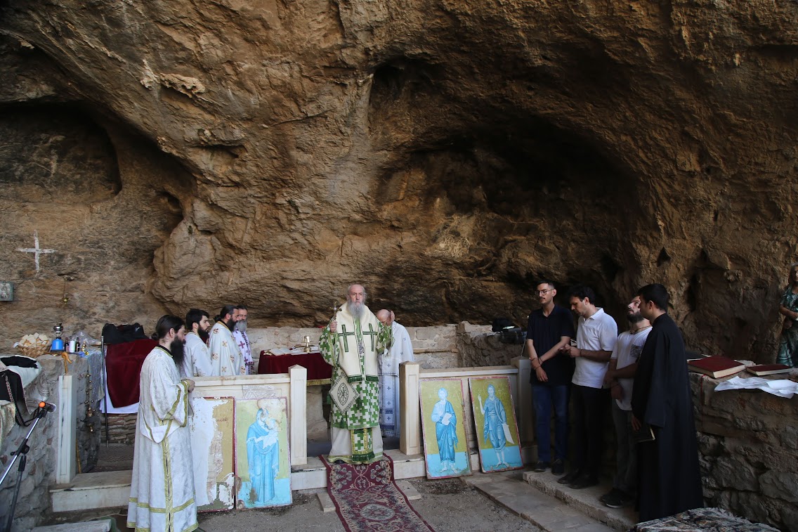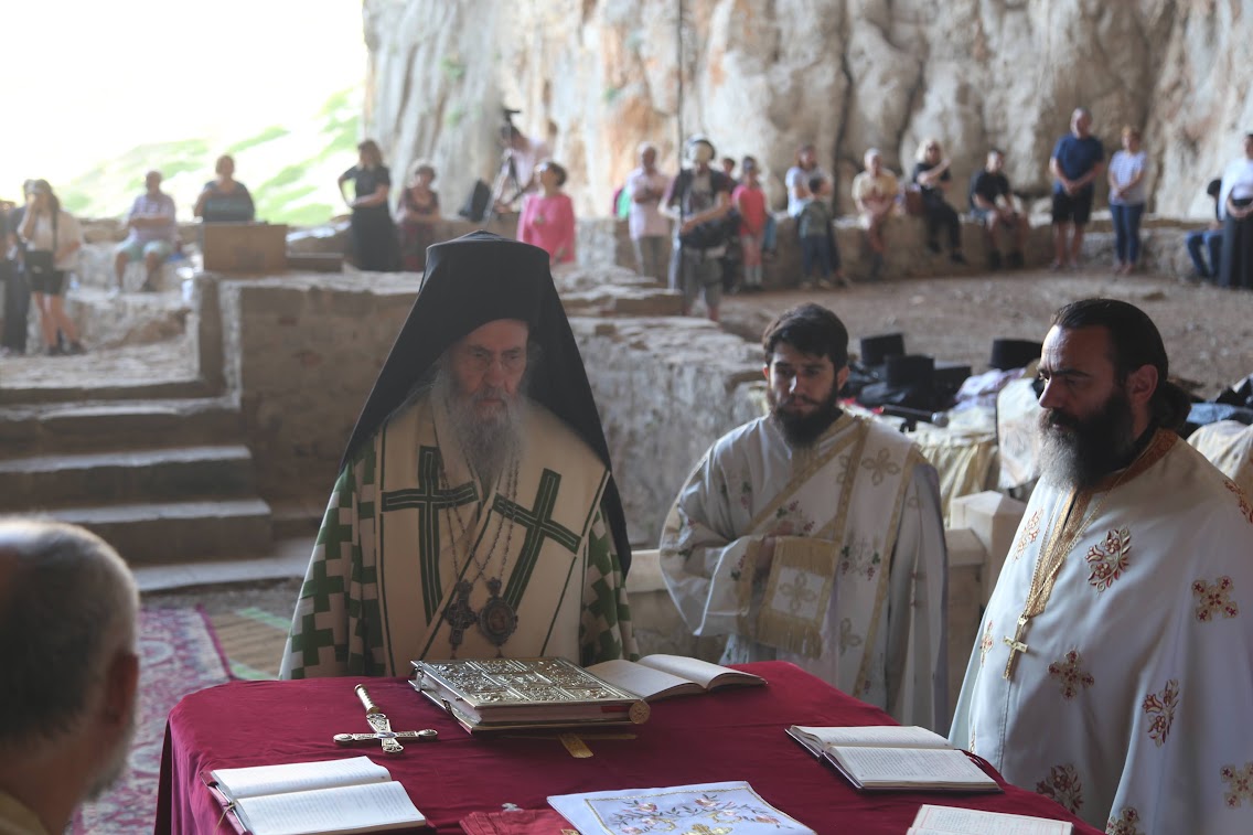 Μετά την θεία Λειτουργία ευχαρίστησε όλους όσοι βοήθησαν για να τελεσθή η θεία Λειτουργία στο Σπήλαιο, τους Ιερείς και Διακόνους που λειτούργησαν, ιδιαιτέρως τον π. Ιωάννη Βλάχο, Εφημέριο της Κάτω Βασιλικής και τους ανθρώπους που μετέφεραν τον κόσμο με τα καΐκια τους, τους ιεροψάλτες, την κ. Ιωάννα Σερμιτζέλη, κινητήρια δύναμη της πανηγύρεως, και όλους όσοι ανέβηκαν για να εκκλησιασθούν. Επίσης, ευχήθηκε να είναι αιωνία η μνήμη των ασκητών που εμόνασαν στο μέρος αυτό και του Αθανασίου Παλιούρα, καθηγητού, που με τους συνεργάτες του ανέσκαψαν το Σπήλαιο.