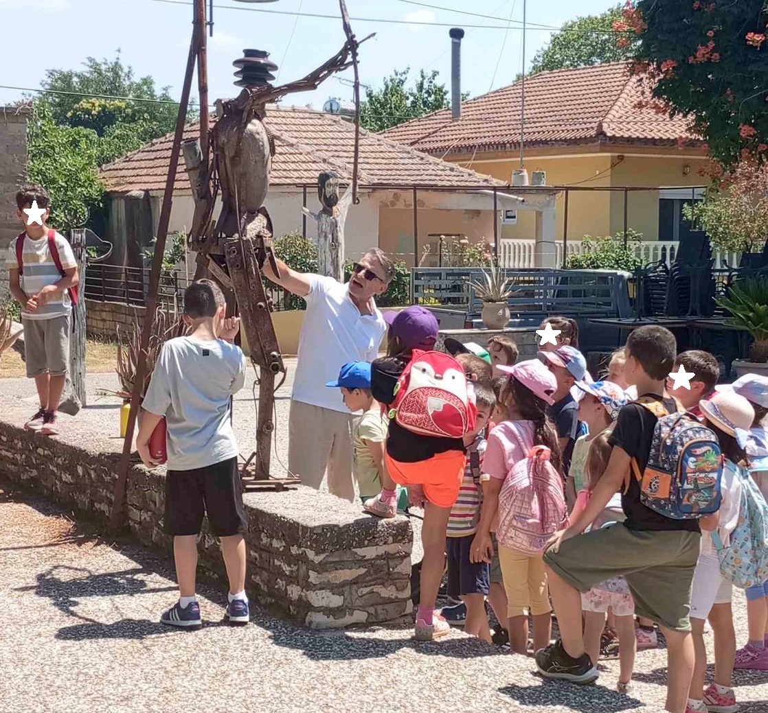 Εκεί είχαν την ευκαιρία να ξεναγηθούν από τον κ. Δημήτρη Μαλεσιάδα, στον όμορφα διαμορφωμένο χώρο του καταστήματος, καθώς και στην πλατεία του χωριού, όπου είναι τοποθετημένα πολλά καλλιτεχνικά εκθέματα και χειροποίητες δημιουργίες του, κατασκευασμένες από ανακυκλώσιμα υλικά, όπως κορμοί δέντρων που βρέθηκαν στον Αχελώο, παλιά ξύλα, παράθυρα και πόρτες, διάφορα μεταλλικά αντικείμενα, παλιά εξαρτήματα από διάφορα μηχανήματα, πέτρες από κτίρια που κατεδαφίστηκαν, τα οποία αν και αρχικά οι κάτοχοί τους τα πέταξαν ως "άχρηστα", τελικά όμως αυτά αναδείχθηκαν και αξιοποιήθηκαν μέσω της τέχνης, για τη δημιουργία γλυπτών και ζωγραφικών έργων.