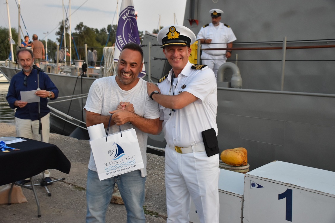 Οι νικητές του αγώνα σε ομαδική φωτογράφιση με τους εκπροσώπους του Πολεμικού Ναυτικού, Υποπλοίαρχο, Άγγελος Μπουρνάζο, τους Πλωτάρχες Θανάση Κατσαβό και Γιώργο Παπαγεωργίου, τον Αντιδήμαρχο της Ιερής Πόλης Σωτήρη Φαράντο, την Πρόεδρο του Λιμενικού Ταμείου Μεσολογγίου, Νεκταρία Αλετρά και τους πανταχού παρόντες εθελοντές ερυθροσταυρίτες της πόλης.