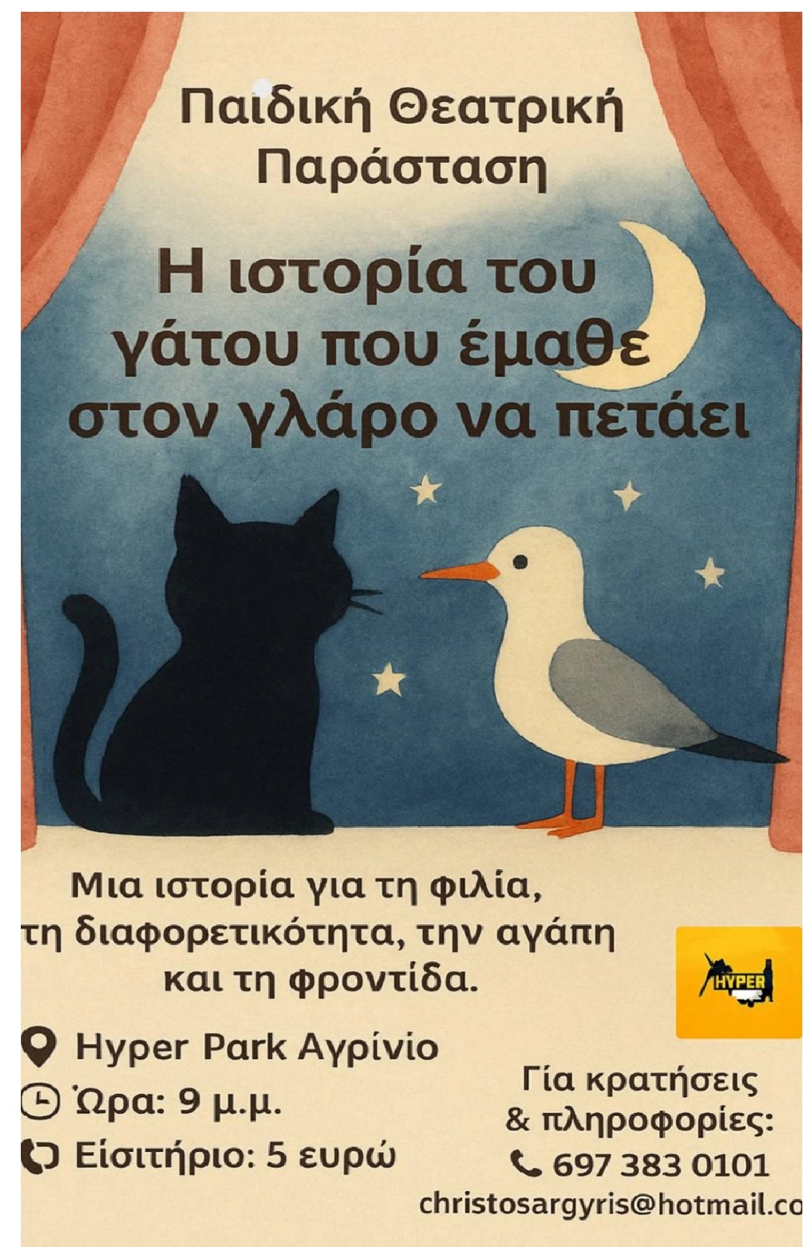 Η θεατρική παράσταση - δραματοποιημένη αφήγηση, “Ο γάτος που έμαθε σε έναν γλάρο να πετάει” βασισμένη στο βιβλίο του Λουίς Σεπούλβεδα, και σε διασκευή της Γεωργίας Καποπούλου, απευθύνεται σε μαθητές νηπιαγωγείων και δημοτικών, ενώ θα παιχθεί την Τρίτη 8 Ιουλίου στις 21.00 μ.μ. στο Hyper Park (Χρήστου Κυριλή, Αγρίνιο).