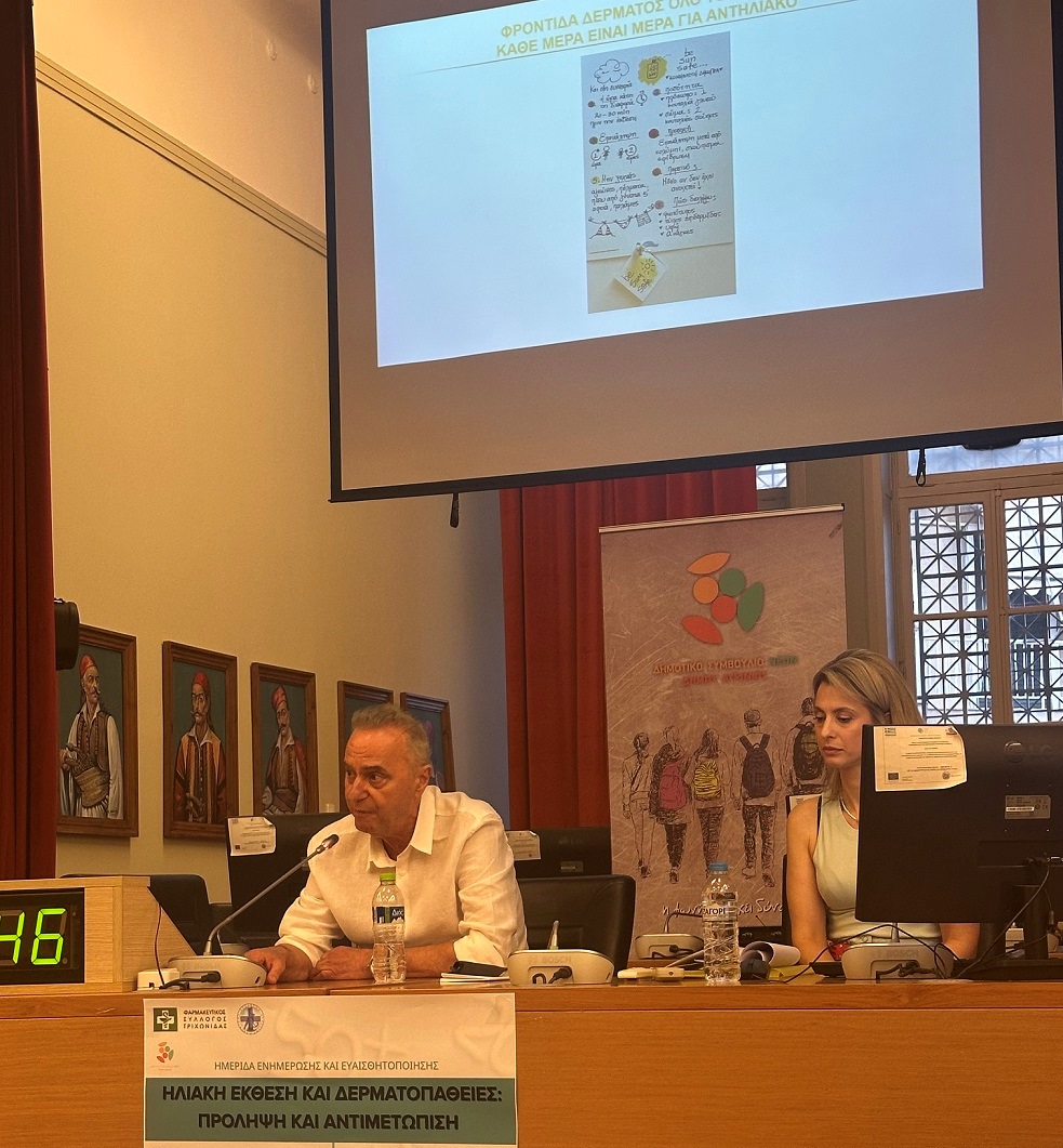 Ο Ιατρός Δερματολόγος, Δημήτρης Σκιαδάς ανέπτυξε διεξοδικά το φαινόμενο των δερματοπαθειών που σχετίζονται με την ηλιακή ακτινοβολία, κάνοντας ιδιαίτερη αναφορά στις φωτοδερματοπάθειες όπως το μελάνωμα και η λεύκη. Υπογράμμισε τον ρόλο της πρόληψης και της τακτικής δερματολογικής εξέτασης, τονίζοντας τις βλαβερές συνέπειες της υπεριώδους ακτινοβολίας (UV).