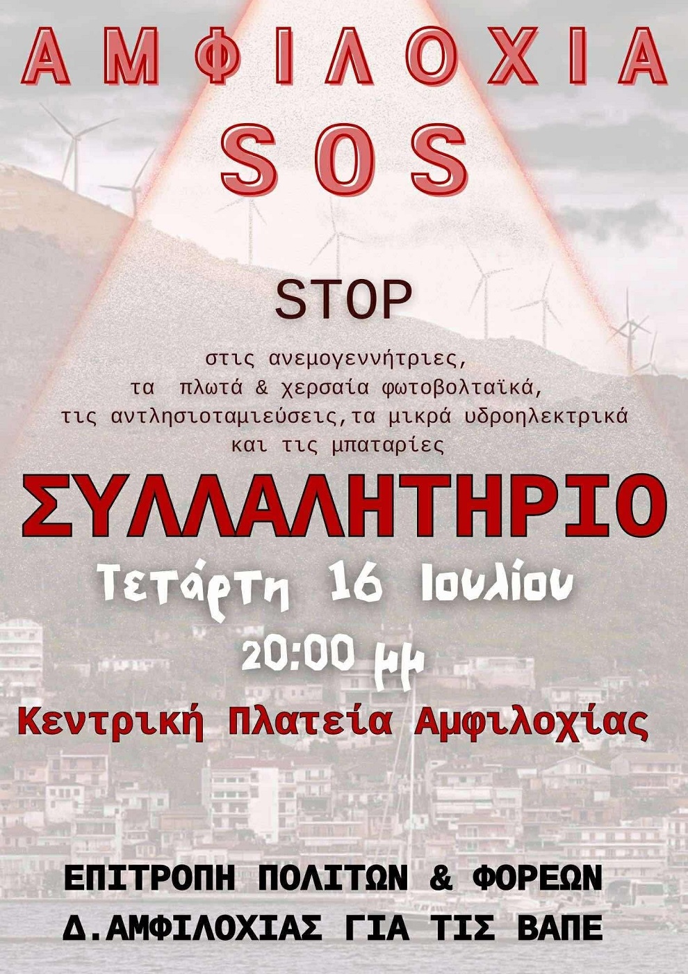 Με ανακοίνωσή του ο Δήμος Αμφιλοχίας ενημερώνει ότι, στηρίζει και θα συμμετέχει στο συλλαλητήριο διαμαρτυρίας ενάντια στα σχέδια εγκατάστασης φωτοβολταϊκών και νέων ανεμογεννητριών στην ευρύτερη περιοχή της Αμφιλοχίας, του Αμβρακικού Κόλπου και του ορεινού όγκου, το οποίο πραγματοποιούν φορείς και ενεργοί πολίτες την Τετάρτη 16 Ιουλίου 2025 στις 20:00 στην πλατεία Αμφιλοχίας.