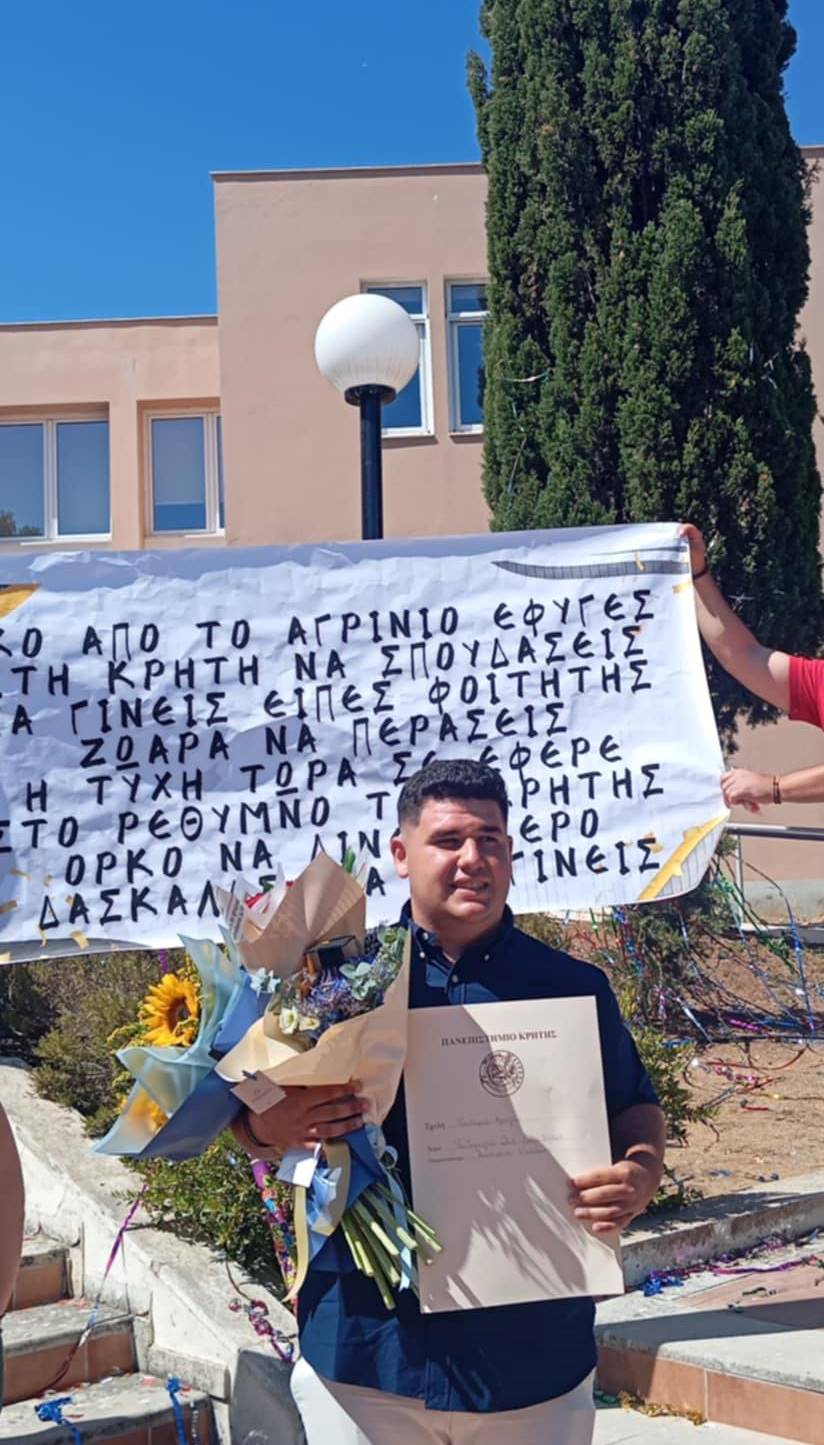 Άξιος πτυχιούχος κατέστη σήμερα ο συμπατριώτης μας Νίκος Ευθ. Αναστασίου, από τα Καλύβια Αγρινίου, ο οποίος έλαβε και επίσημα τον τίτλο σπουδών του Παιδαγωγικού Τμήματος Δημοτικής Εκπαίδευσης, της Σχολής Επιστημών Αγωγής, του Πανεπιστημίου Κρήτης.
