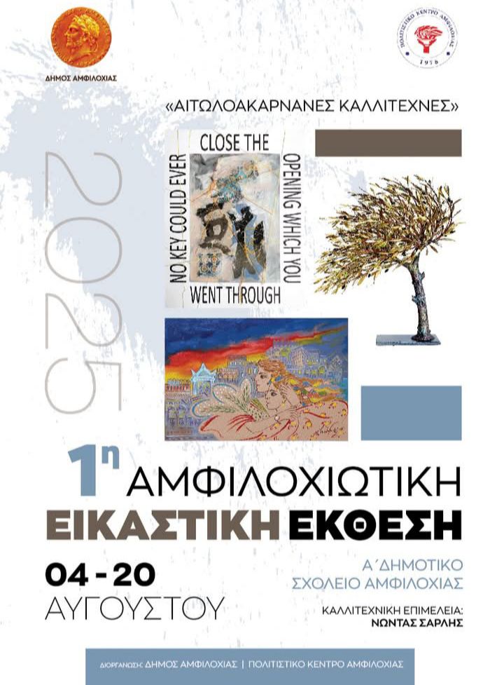 Έναν κύκλο εικαστικών συναντήσεων εγκαινιάζει ο Δήμος Αμφιλοχίας σε συνεργασία με το Πολιτιστικό Κέντρο Αμφιλοχίας, με την «1η Αμφιλοχιώτικη Εικαστική Έκθεση - Αιτωλoακαρνάνες Καλλιτέχνες» που ανοίγει τις πύλες της την Δευτέρα 4 Αυγούστου στις 20:00 μ.μ. στο 1ο Δημοτικό Σχολείο Αμφιλοχίας, στο πλαίσιο των Πανακαρνανείων 2025.