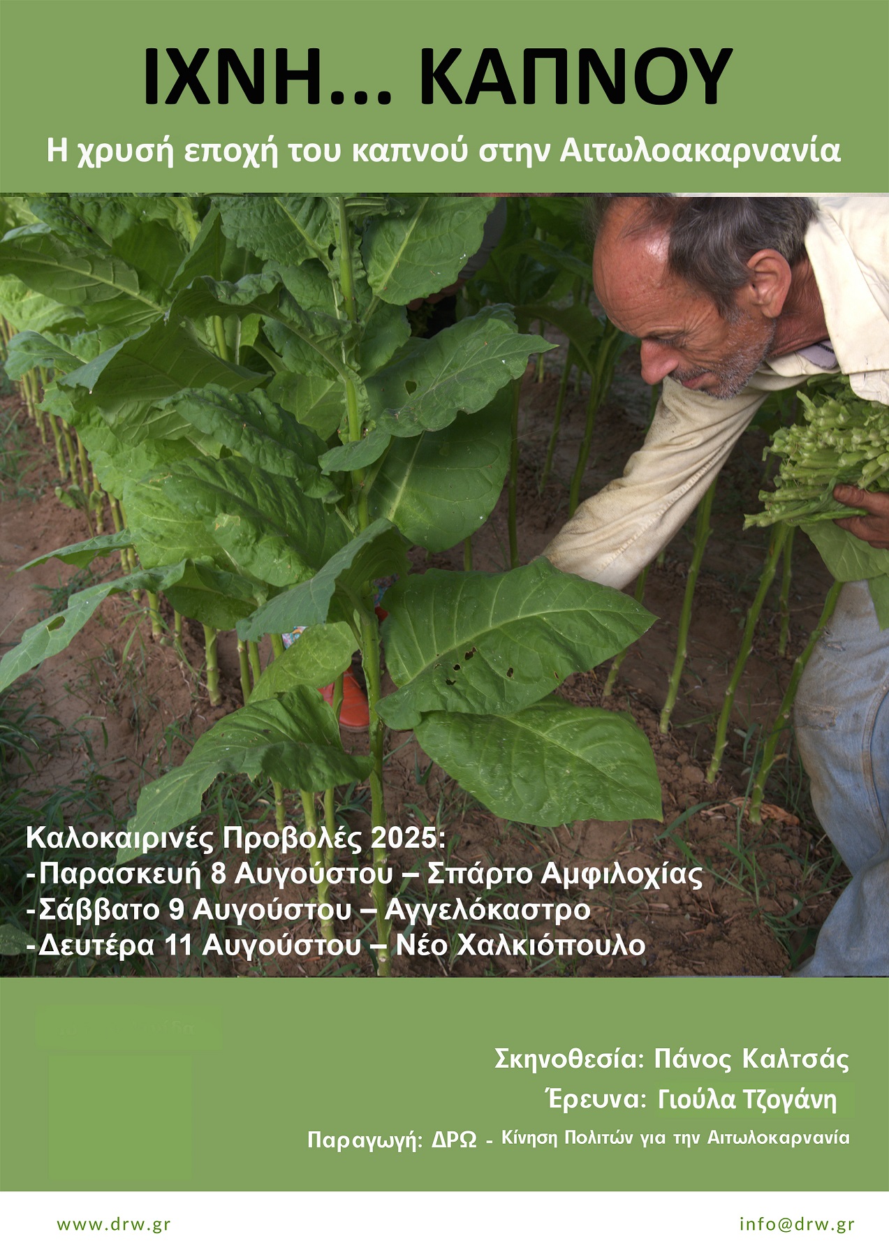 Το ιστορικό ντοκιμαντέρ «Ίχνη Καπνού», σε σκηνοθεσία Πάνου Καλτσά και έρευνα Γιούλας Τζογάνη, συνεχίζει τις θερινές του προβολές στην περιφέρεια του νομού, αναδεικνύοντας την ιστορία του καπνού και της καπνεργασίας στην Αιτωλοακαρνανία, μέσα από σπάνιο αρχειακό υλικό και βιωματικές αφηγήσεις.
