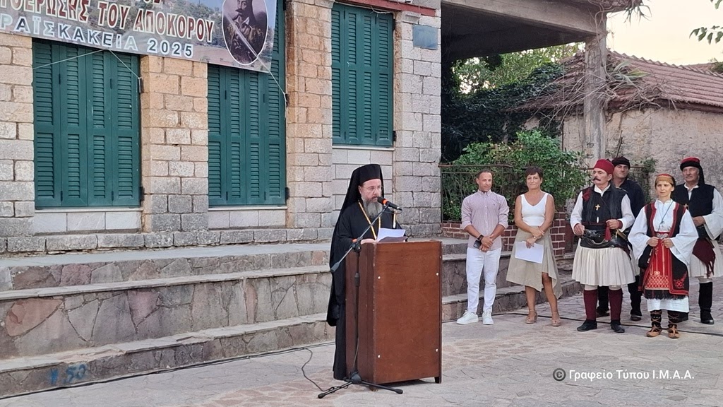 «Διανύοντας, αγαπητοί μου, την ευλογημένη περίοδο του Δεκαπενταυγούστου, βρισκόμαστε σήμερα εδώ, στον ιστορικό τόπο του Πετροχωρίου, αποτίοντας φόρο τιμής και οφειλόμενης ευγνωμοσύνης στην μνήμη των προγόνων μας, που υπό τις οδηγίες του αρχιστρατήγου Γεωργίου Καραϊσκάκη, έδωσαν σειρά μαχών το καλοκαίρι του 1825, καταστέλλοντας τις τούρκικες δυνάμεις και απελευθερώνοντας το Απόκουρο. Οι εορταστικές αυτές εκδηλώσεις, αποτελούν κι ένα προάγγελο του επετειακού έτους από την Διακοσιοστή Επέτειο της ηρωικής Εξόδου του Μεσολογγίου που πλησιάζει. Ένα έτος, που η Τοπική μας Εκκλησία, θα διοργανώσει με τη χάρη του Θεού, λατρευτικές και πολιτιστικές εκδηλώσεις, καθ’ όλη την διάρκειά του, με την συμμετοχή των Ενοριών, των Ιερών Μονών, των κατηχητικών σχολείων, των τομέων - φορέων και ιδρυμάτων που υπάγονται στην Τοπική μας Εκκλησία.