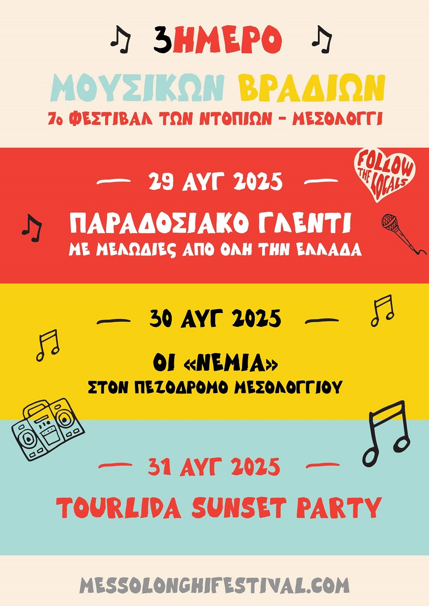 Το 7ο Φεστιβάλ των Ντόπιων (Messolonghi By Locals) που φέτος πραγματοποιείται το τριήμερο 29–30–31 Αυγούστου, είναι μια πολιτιστική γιορτή που αναδεικνύει την τοπική ταυτότητα και σας προσκαλεί να γίνετε μέρος αυτής της ξεχωριστής εμπειρίας.