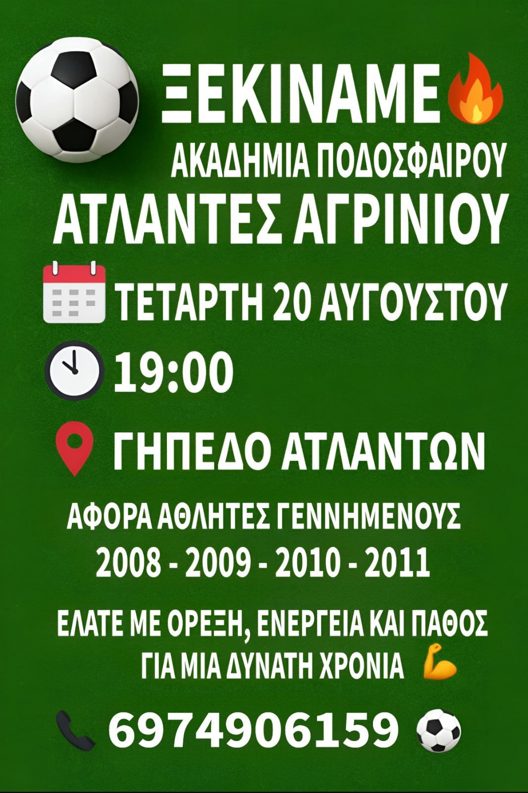 Η Ακαδημία Ποδοσφαίρου Άτλαντες Αγρινίου ανακοινώνει την έναρξη της προετοιμασίας για τα αγωνιστικά τμήματα των ηλικιών 2008 - 2009 – 2010 – 2011.