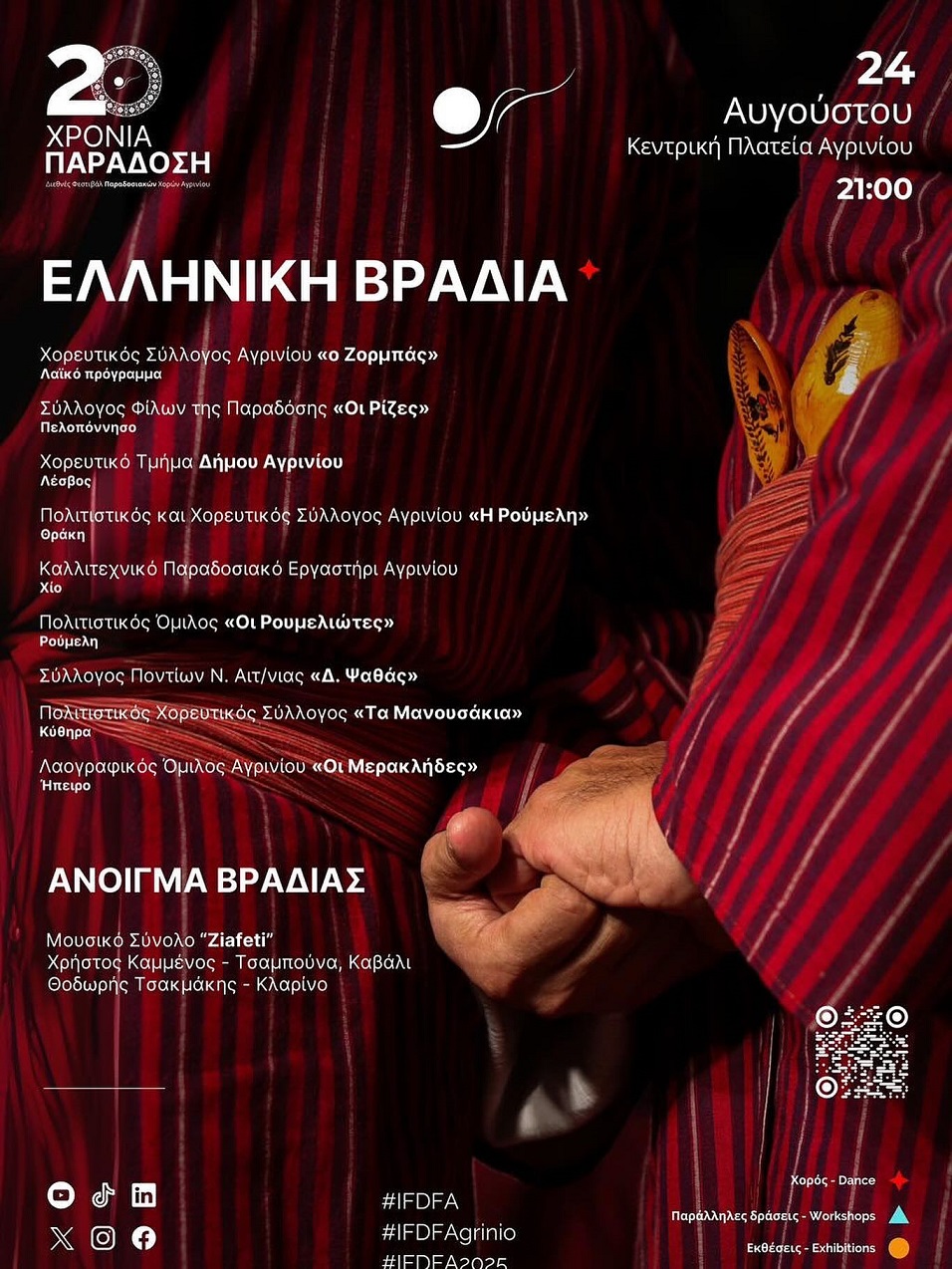 Για πέντε μέρες, από τις 24 έως τις 28 Αυγούστου, το Αγρίνιο ζει στον ρυθμό της μουσικής και της παράδοσης. Το 20ό Διεθνές Φεστιβάλ Παραδοσιακών Χορών, που αποτελεί πλέον θεσμό με διεθνή ακτινοβολία, φέρνει στο ίδιο χοροστάσι συγκροτήματα από την περιοχή μας και από όλο τον κόσμο.