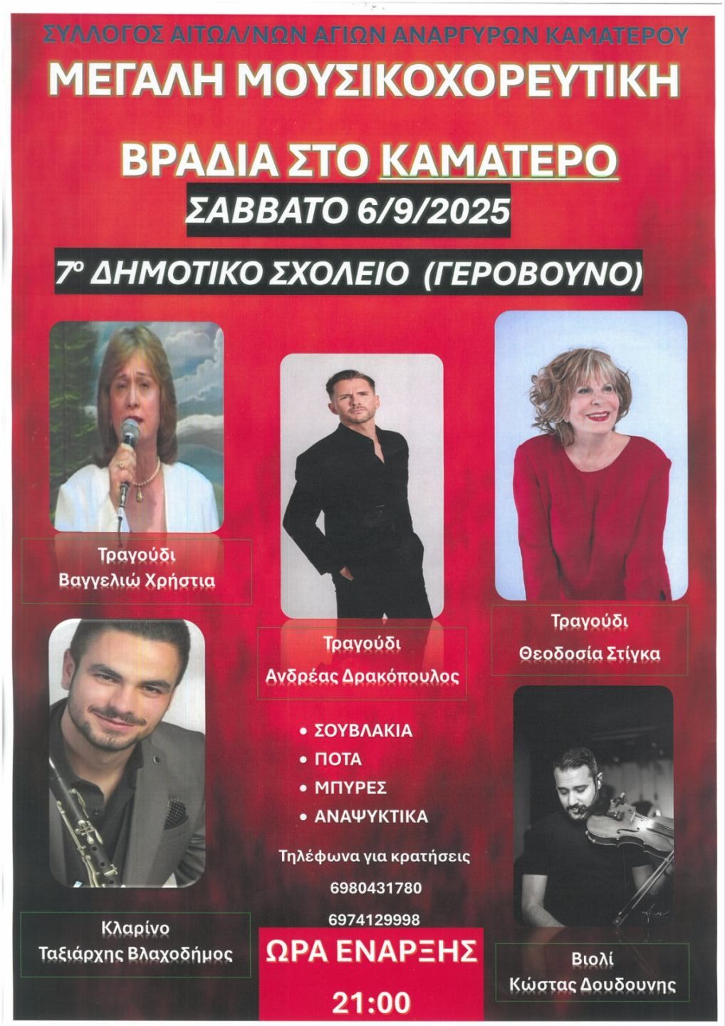 Ο Σύλλογος Αιτωλ/νων Αγίων Αναργύρων Καματερού σας περιμένει όλους για μια όμορφη φθινοπωρινή βραδιά, γεμάτη από χορούς και τραγούδια!