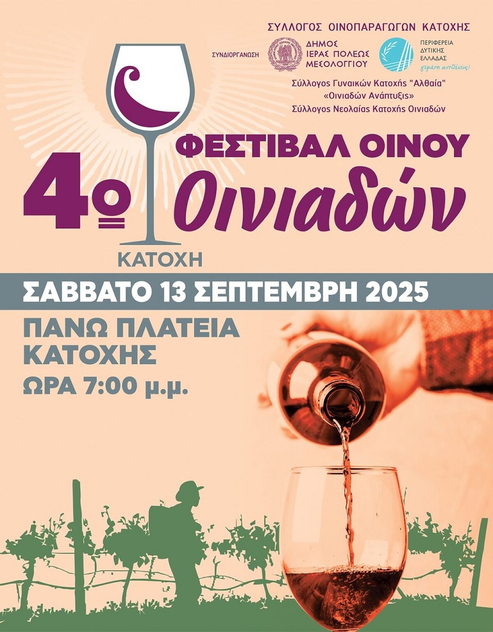 Στην ιστορική κωμόπολη της Κατοχής, στην οινοπαραγωγό περιοχή των Οινιαδών, συνεχίζονται με έντονους ρυθμούς οι προετοιμασίες για το «4ο Φεστιβάλ Οίνου Οινιαδών» που πρόκειται να λάβει χώρα το Σάββατο 13 Σεπτεμβρίου 2025 και ώρα 7:00 μ.μ. στην άνω πλατεία Κατοχής, αναδεικνύοντας για μια ακόμη φορά την μακραίωνη σχέση των Οινιαδών με την αμπελουργία και το κρασί!