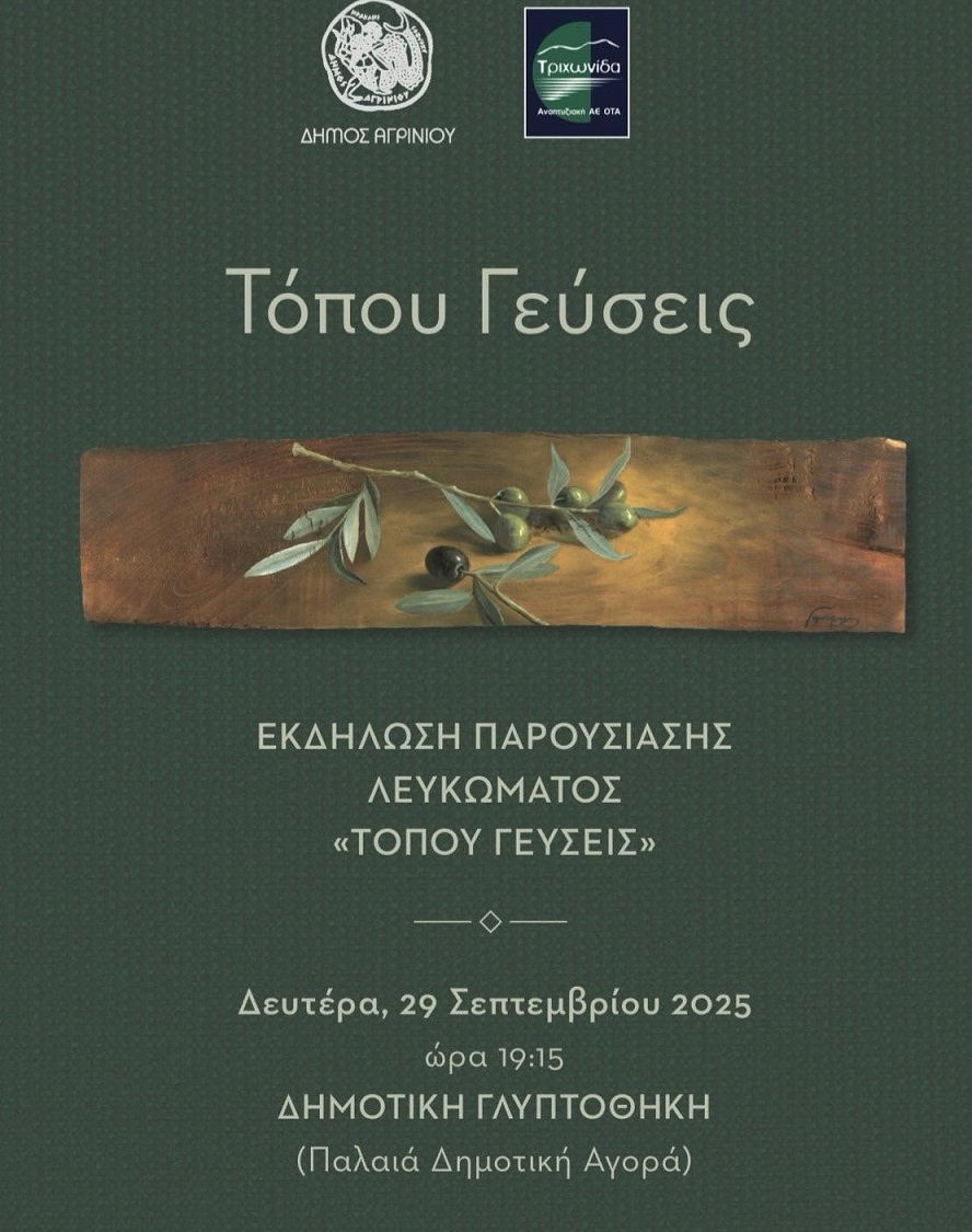 Ο Δήμος Αγρινίου και η Αναπτυξιακή Εταιρεία Τριχωνίδα ΑΕ, παρουσιάζουν την Δευτέρα 29 Σεπτεμβρίου στις 19.15 μ.μ. στην Δημοτική Γλυπτοθήκη (Παλαιά Αγορά) στο Αγρίνιο, το λεύκωμα με τίτλο: «Τόπου γεύσεις».