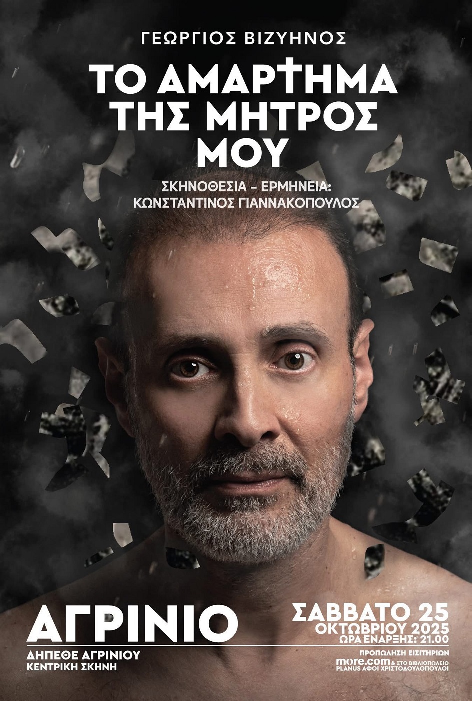 - Το αμάρτημα της μητρός μου» του Γεωργίου Βιζυηνού, σε σκηνοθεσία και ερμηνεία Κωνσταντίνου Γιαννακόπουλου, έρχεται για μία μόνο βραδιά στο Δημοτικό Θέατρο Αγρινίου, το Σάββατο 25 Οκτωβρίου 2025.
