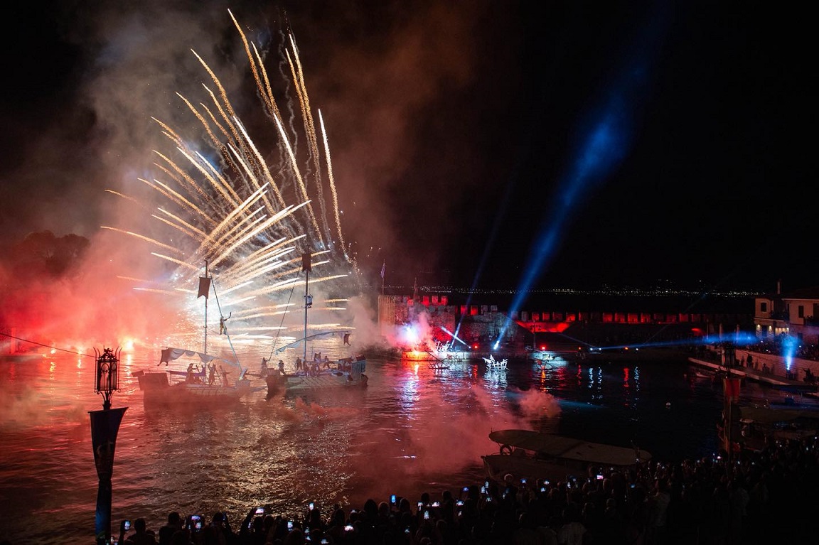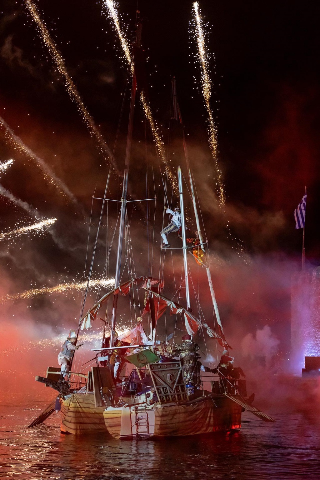 Το εμβληματικό Ενετικό Λιμάνι μεταμορφώθηκε σε σκηνικό ιστορικής αναβίωσης, όπου εικόνες, φως και ήχος συνέθεσαν μία μοναδική εμπειρία συγκίνησης και υπερηφάνειας. Η σκηνοθετική προσέγγιση του Δημήτρη Σιούντα συνδύασε θεατρικά δρώμενα, μουσική και εικαστικές παρεμβάσεις, αναδεικνύοντας με καλλιτεχνική ευαισθησία τα διαχρονικά μηνύματα που πηγάζουν από τη Ναυμαχία της Ναυπάκτου.