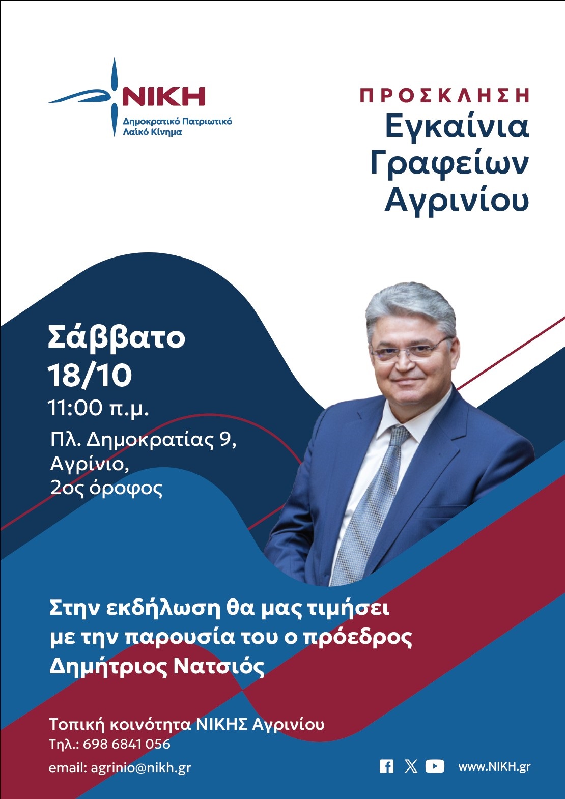 Τα Γραφεία Αγρίνιου της ΝΙΚΗΣ (Δημοκρατικό Πατριωτικό Λαϊκό Κίνημα) βρίσκονται στον 2ο όροφο επί της Πλ. Δημοκρατίας 9, στο κέντρο της πόλης.