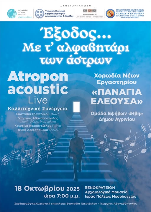 Η Εφορεία Αρχαιοτήτων Αιτωλοακαρνανία και Λευκάδος σε συνδιοργάνωση με την Περιφέρεια Δυτικής Ελλάδας και το Εργαστήρι Ειδικής Επαγγελματικής Αγωγής & Αποκαταστάσεως "Παναγία Ελεούσα", πραγματοποιούν την καλλιτεχνική συνέργεια, με τίτλο "Έξοδος... με τ' αλφαβητάρι των άστρων" το Σάββατο 18 Οκτωβρίου και ώρα 7:00 μ.μ. στο Ξενοκράτειο Αρχαιολογικό Μουσείο, στο Μεσολόγγι.