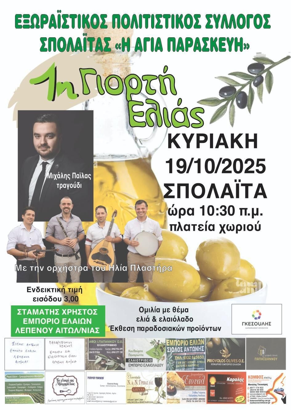 Ο Πολιτιστικός και Εξωραϊστικός Σύλλογος «Η Αγία Παρασκευή» και ο Δήμος Αγρινίου συνδιοργανώνουν την εκδήλωση «Η Γιορτή της Ελιάς», την Κυριακή 19 Οκτωβρίου 2025, στις 10:30 το πρωί, στην πλατεία του χωριού Σπολάιτα.