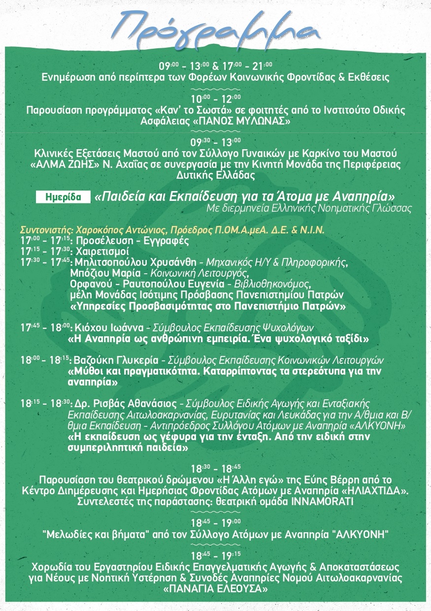 Από τις 09:00 το πρωί έως τις 21:00 το βράδυ, οι επισκέπτες θα έχουν την ευκαιρία να περιηγηθούν στα περίπτερα των Φορέων Κοινωνικής Φροντίδας, να ενημερωθούν για τις δράσεις και τα προγράμματά τους και να γνωρίσουν από κοντά το έργο που επιτελούν στην τοπική κοινωνία. Παράλληλα, θα πραγματοποιηθούν κλινικές εξετάσεις μαστού (09:30 – 13:00) από τον Σύλλογο Γυναικών με Καρκίνο του Μαστού «Άλμα Ζωής» Ν. Αχαΐας σε συνεργασία με την Κινητή Μονάδα της Περιφέρειας Δυτικής Ελλάδας, καθώς και παρουσίαση του προγράμματος «Καν’ το Σωστά» του Ινστιτούτου Οδικής Ασφάλειας «Πάνος Μυλωνάς» σε φοιτητές του Πανεπιστημίου Πατρών.