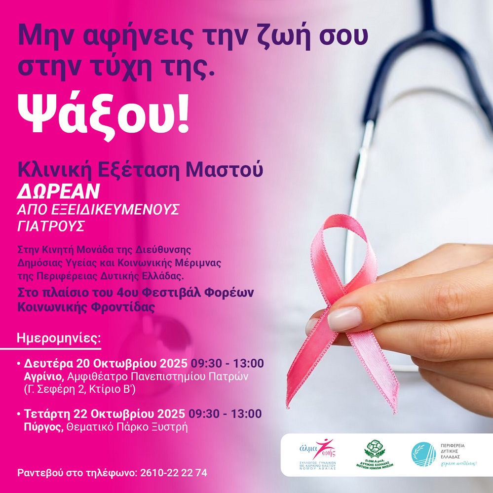 Με πρώτο σταθμό το Αγρίνιο, στο κτίριο Β’ του Πανεπιστημίου Πατρών (Γ. Σεφέρη 2) ξεκινά τη Δευτέρα 20 Οκτωβρίου 2025, το 4ο Φεστιβάλ Φορέων Κοινωνικής Φροντίδας, της Περιφερειακής Ομοσπονδίας Ατόμων με Αναπηρία Δυτικής Ελλάδας και Νοτίων Ιονίων Νήσων.