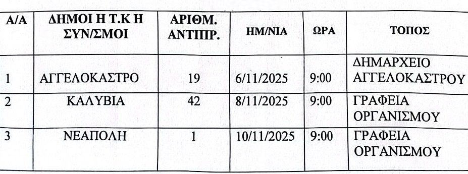 Οι Τοπικές Συνελεύσεις θα γίνουν κατά την αναγραφόμενη στον κάτωθι πίνακα - πρόγραμμα, ημερομηνία ώρα και τόπο και στην περίπτωση που δεν υπάρξει απαρτία μελών των αγροκτημάτων, (για να υπάρχει απαρτία χρειάζεται το μισό και ένας του συνόλου από τους ψήφους του θεωρημένου από τον Ειρηνοδίκη και τον Πρόεδρο και το Γραμματέα του Οργανισμού Πρόχειρο Κτηματοκατάλογο )