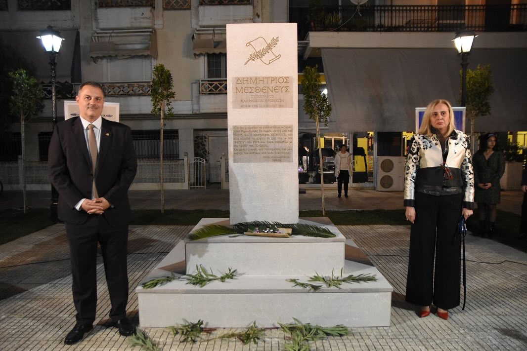 Στην Πλατεία Ιωάννη-Ιάκωβου Μάγερ, παρουσία εκπροσώπων αρχών, φορέων, απογόνων του Δημήτριου Μεσθενέα και πλήθους πολιτών, τελέστηκαν τα αποκαλυπτήρια του μνημείου, έργο του καταξιωμένου εικαστικού Βαγγέλη Ρόμπολα, το οποίο βρίσκεται τοποθετημένο ακριβώς δίπλα σε εκείνο του Ελβετού Φιλέλληνα και «πατέρα» της ελληνικής Δημοσιογραφίας.