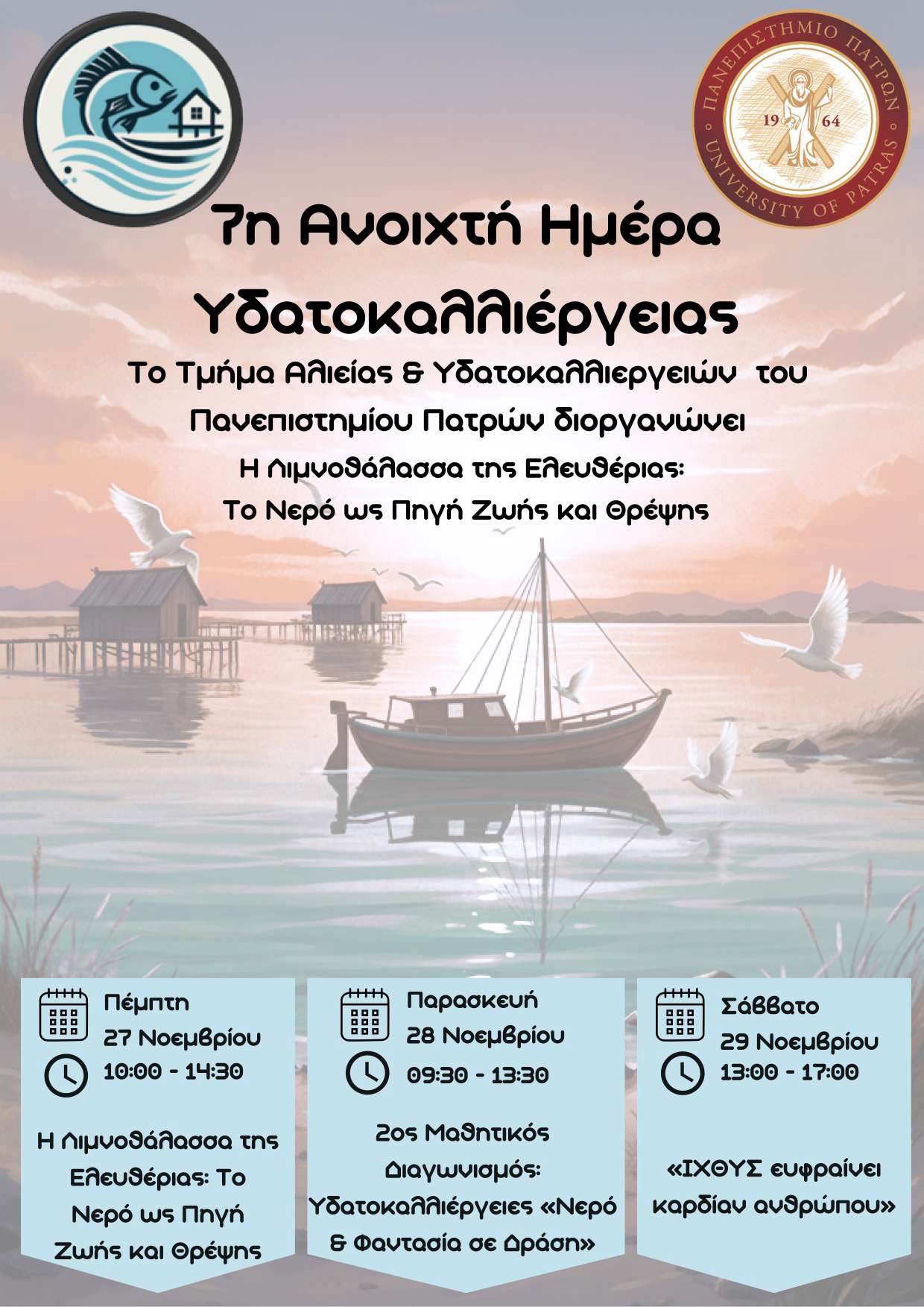 Το Τμήμα Αλιείας και Υδατοκαλλιεργειών της Σχολής Γεωπονικών Επιστημών του Πανεπιστημίου Πατρών σας προσκαλεί στις ανοικτές εκδηλώσεις εορτασμού της «7η Ημέρα Υδατοκαλλιεργειών», που θα πραγματοποιηθεί στις 27, 28 και 29 Νοεμβρίου 2025 στην Ιερά Πόλη Μεσολογγίου (Κεντρικό Αμφιθέατρο ΤΑΥ).