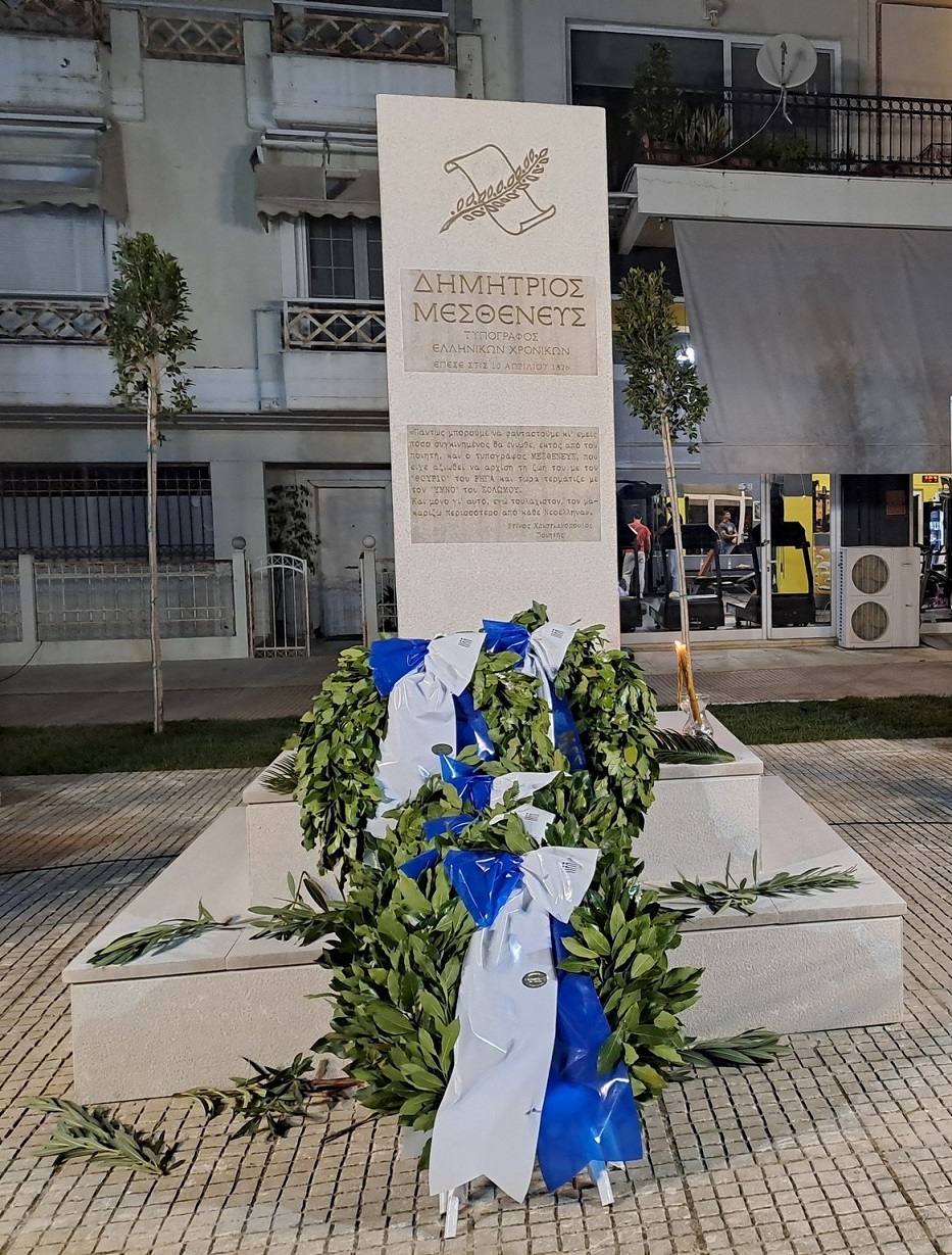 Ο Δήμαρχος παρέδωσε στον κ. Γαρμπή αναμνηστικό μετάλλιο, ως την οφειλόμενη αναγνώριση της προσωπικής του πρωτοβουλίας και αδιάκοπης προσπάθειας, η οποίες υπήρξαν καθοριστικές για την επίσημη αναγνώριση του έργου και της συμβολής του Δημητρίου Μεσθενέα στον Επαναστατικό Τύπο και στον Αγώνα του 1821.