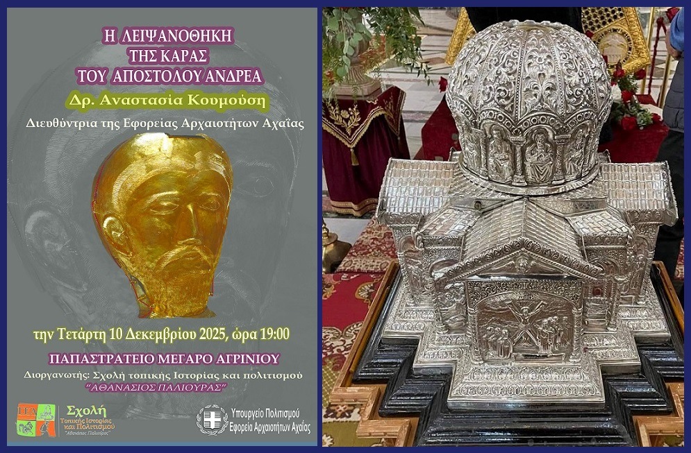 Η Σχολή Τοπικής Ιστορίας και Πολιτισμού «Αθανάσιος Παλιούρας» της ΓΕΑ, παρουσιάζει την Τετάρτη 10 Δεκεμβρίου και ώρα 19:00 στο Παπαστράτειο Μέγαρο Αγρινίου, την εισήγηση της Διευθύντριας Εφορίας Αρχαιοτήτων Αχαΐας, Δρ. Αναστασίας Κουμούση, με θέμα «Η Λειψανοθήκη της κάρας του Αποστόλου Ανδρέα».