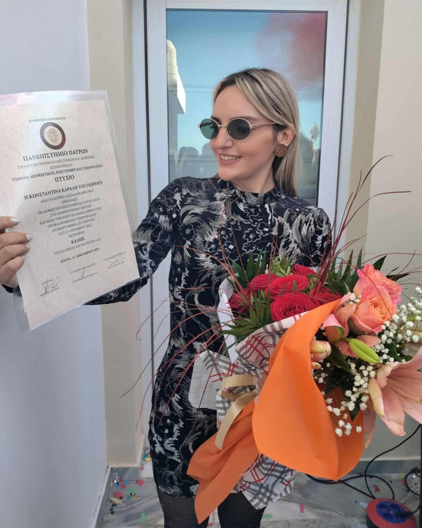 Άξια πτυχιούχος κατέστη η συμπατριώτισσά μας Κωνσταντίνα Γ. Καραλή, η οποία έλαβε και επίσημα τον τίτλο σπουδών του Διοικητικής Επιστήμης & Τεχνολογίας της Σχολής Οικονομικών Επιστημών & Διοίκησης Επιχειρήσεων (ΣΟΕΔΕ) του Πανεπιστημίου Πατρών.