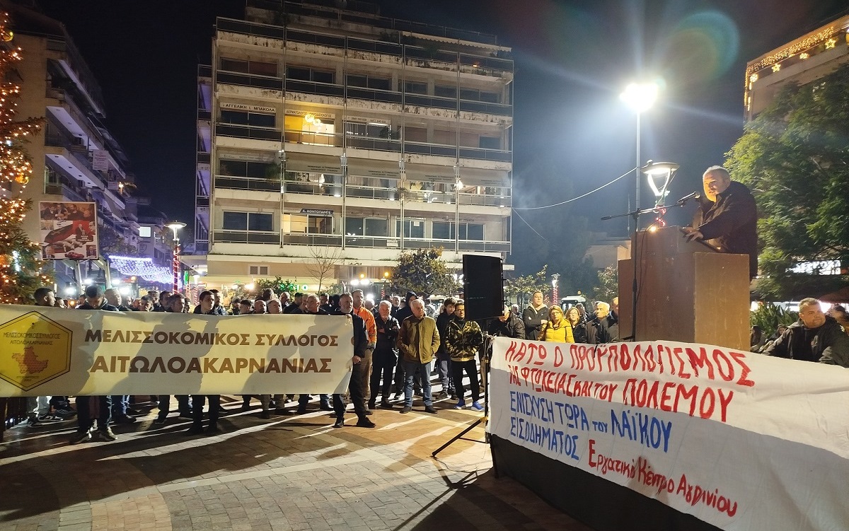 Πολλοί αγρότες με τα τρακτέρ τους, στο πλαίσιο των δράσεων που έχουν ανακοινώσει από το μπλόκο του Αγγελοκάστρου, συμμετείχαν το βράδυ της Τρίτης 16/12 στην πλατεία Δημοκρατίας Αγρινίου, στην συγκέντρωση που οργανώθηκε από το Εργατικό Κέντρο του Αγρινίου ενάντια στην ψήφιση του προϋπολογισμού.