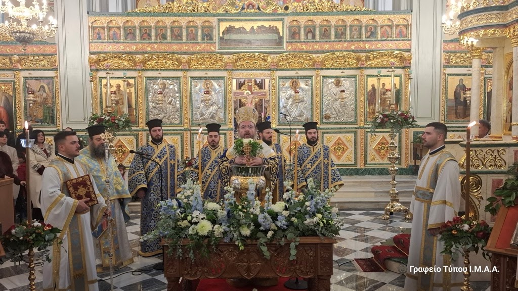 Αμέσως μετά τη Θεία Λειτουργία, ο Σεβασμιώτατος τέλεσε την Ακολουθία του Μεγάλου Αγιασμού εντός του Ναού και στη συνέχεια, με λιτανευτική πομπή, άπαντες κατευθύνθηκαν στο Λιμάνι της Ιεράς Πόλεως, όπου πραγματοποιήθηκε η Τελετή Κατάδυσης του Τιμίου Σταυρού και ο Αγιασμός των Υδάτων.