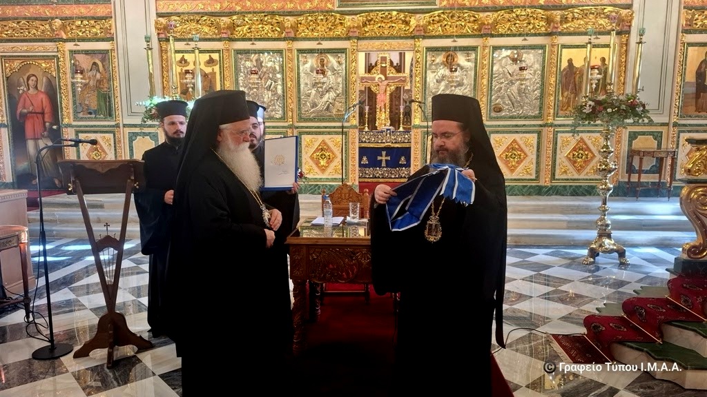 Ο Σεβασμιώτατος στη συνέχεια απένειμε στον σεπτό Γέροντά του, Μητροπολίτη Δημητριάδος και Αλμυρού κ. Ιγνάτιο, την Ανώτατη Τιμητική Διάκριση της Ιεράς Μητροπόλεως Αιτωλίας και Ακαρνανίας, ήτοι τον Χρυσούν Σταυρόν μετά Μεταλλίου. Συγκινημένος, αναφέρθηκε στο πρόσωπο και την εκκλησιαστική προσφορά του Μητροπολίτου Ιγνατίου, τονίζοντας ότι διακρίνεται για την ταπείνωση, την εργατικότητα, τα άπειρα αποθέματα αγάπης και συγχωρητικότητας προς όλους, την αφοσίωσή του στην Εκκλησία και στο έργο του Θεού, την προσήλωσή του στις ευαγγελικές επιταγές και την διδασκαλία των Αγίων Πατέρων. «Κοντά του έζησα το διαρκώς θυσιαζόμενο πνεύμα της κένωσης και της προσφοράς από όρθρου βαθέος έως φυλακής νυκτός και διδάχθηκα ότι η Εκκλησία πρέπει να είναι ανοικτή, δυνατή και ζωντανή, έτοιμη να υποδεχθεί τον κάθε άνθρωπο και φροντίζοντας στο πρόσωπό του την ζωντανή εικόνα του Θεού» ανέφερε μεταξύ άλλων και τον ευχαρίστησε για όσα έζησε και διδάχθηκε πλησίον του.