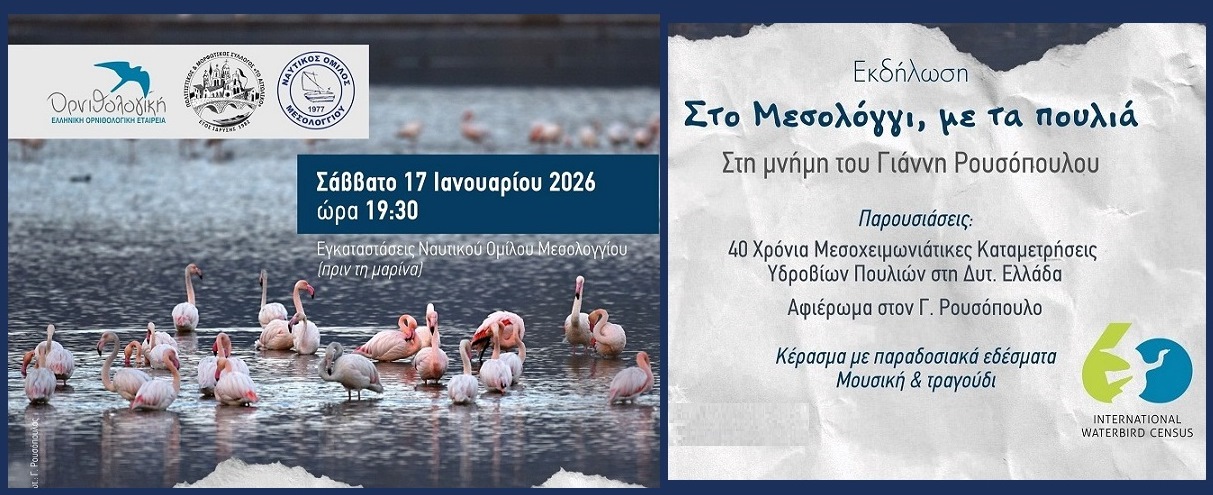 Στην καρδιά των Μεσοχειμωνιάτικων Καταμετρήσεων Υδροβίων Πουλιών και σε έναν από τους σημαντικότερους υγρότοπους της χώρας για τα υδρόβια πουλιά, oΠολιτιστικός & Μορφωτικός Σύλλογος "Το Αιτωλικό" σας προσκαλεί το Σάββατο, 17 Ιανουαρίου 2026 στις 19:30 μ.μ. στις εγκαταστάσεις του Ναυτικού Ομίλου Μεσολογγίου (πριν τη μαρίνα) σε μια ανοιχτή εκδήλωση αφιερωμένη στη μνήμη του Γιάννη Ρουσόπουλου.