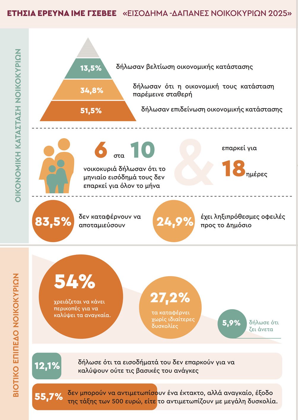 Η ετήσια έρευνα του ΙΜΕ ΓΣΕΒΕΕ για το εισόδημα και τις δαπάνες διαβίωσης των νοικοκυριών 2025 (14η κατά σειρά) αποτυπώνει τη συνεχιζόμενη και εντεινόμενη πίεση που δέχονται τα ελληνικά νοικοκυριά. Τα φετινά ευρήματα δείχνουν ότι οι οικονομικές δυσκολίες δεν περιορίζονται πλέον στα χαμηλά εισοδήματα, αλλά επεκτείνονται και στα μεσαία στρώματα, καθώς οι πληθωριστικές πιέσεις λειτουργούν σωρευτικά και εξαντλούν τις αντοχές των νοικοκυριών.