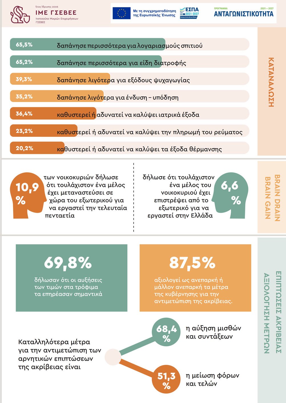 Παράλληλα, οι ανισότητες παραμένουν έντονες, με τα χαμηλότερα εισοδηματικά στρώματα και τα μονοπρόσωπα νοικοκυριά να αντιμετωπίζουν τις μεγαλύτερες δυσκολίες, ενώ η απαισιοδοξία για το μέλλον ενισχύεται. Σε αυτό το πλαίσιο,αξιολογούνται ως ανεπαρκή τα υφιστάμενα μέτρα αντιμετώπισης της ακρίβειας και προτάσσονται λύσεις δομικού χαρακτήρα, όπως η αύξηση των μισθών, οι φορολογικές ελαφρύνσεις και ο έλεγχος των τιμών, που ενισχύουν ουσιαστικά το εισόδημα και την οικονομική ασφάλεια των νοικοκυριών.