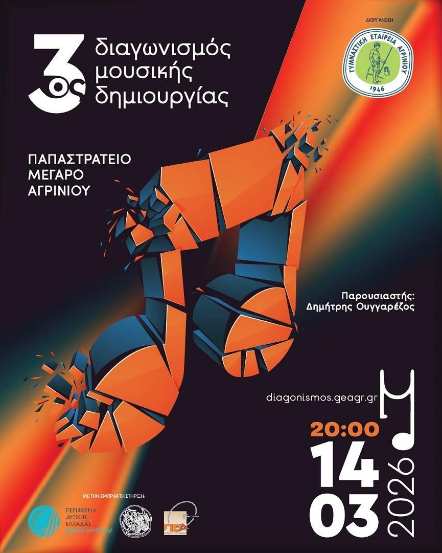 Ο 3ος Διαγωνισμός Μουσικής Δημιουργίας, που διοργανώνει η Γυμναστική Εταιρεία Αγρινίου, σε συνεργασία με την Περιφέρεια Δυτικής Ελλάδας, το Δήμο Αγρινίου και την Π.Ε.Δ. Δυτικής Ελλάδας, έχει περάσει στην τελική του φάση και απομένουν λίγες ημέρες για τη διεξαγωγή του.