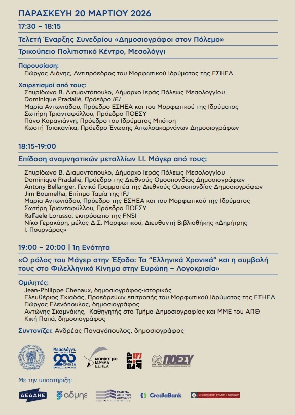 Με αφορμή τη διακοσιοστή επέτειο από την Ηρωική Έξοδο (1826–2026), ο Δήμος Ιεράς Πόλεως Μεσολογγίου, το Μορφωτικό Ίδρυμα της ΕΣΗΕΑ και η ΠΟΕΣΥ συνδιοργανώνουν το συνέδριο με τίτλο «Οι Δημοσιογράφοι στον Πόλεμο», το οποίο θα πραγματοποιηθεί την Παρασκευή 20 και το Σάββατο 21 Μαρτίου 2026, στο Τρικούπειο Πολιτιστικό Κέντρο.